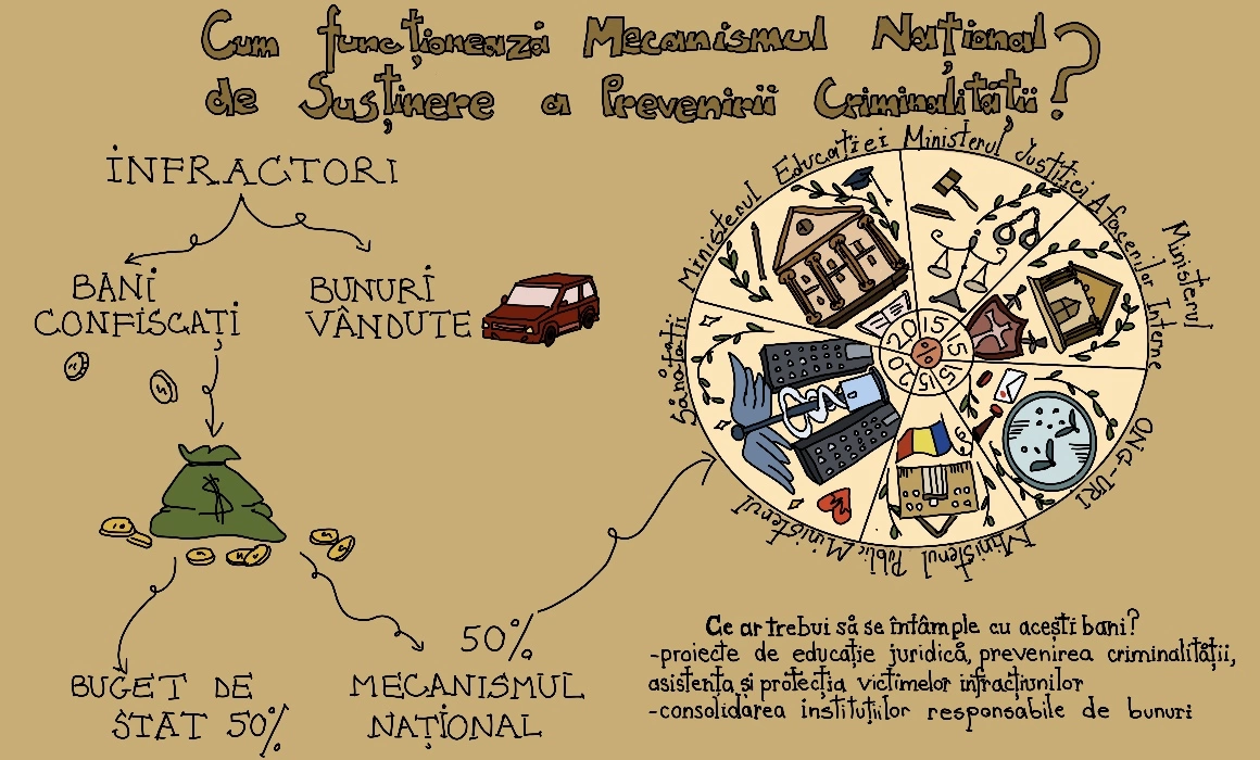 Din 2023 funcționează în România Mecanismul Național de Susținere a Prevenirii Criminalității, prin care jumătate din banii adunați în fiecare an din confiscări și vânzarea bunurilor se împart între cinci ministere, pentru programe de „educație juridică, prevenirea criminalității, asistența și protecția victimelor infracțiunilor”, dar și pentru „consolidarea capacității administrative, inclusiv logistice” a instituțiilor responsabile de bunurile sechestrate. Cealaltă jumătate se duce direct la bugetul de stat. Doar o mică parte din banii rulați prin Mecanism, 15%, poate ajunge la ong-urile din România pentru prevenirea criminalității și sprijinirea victimelor infracțiunilor.