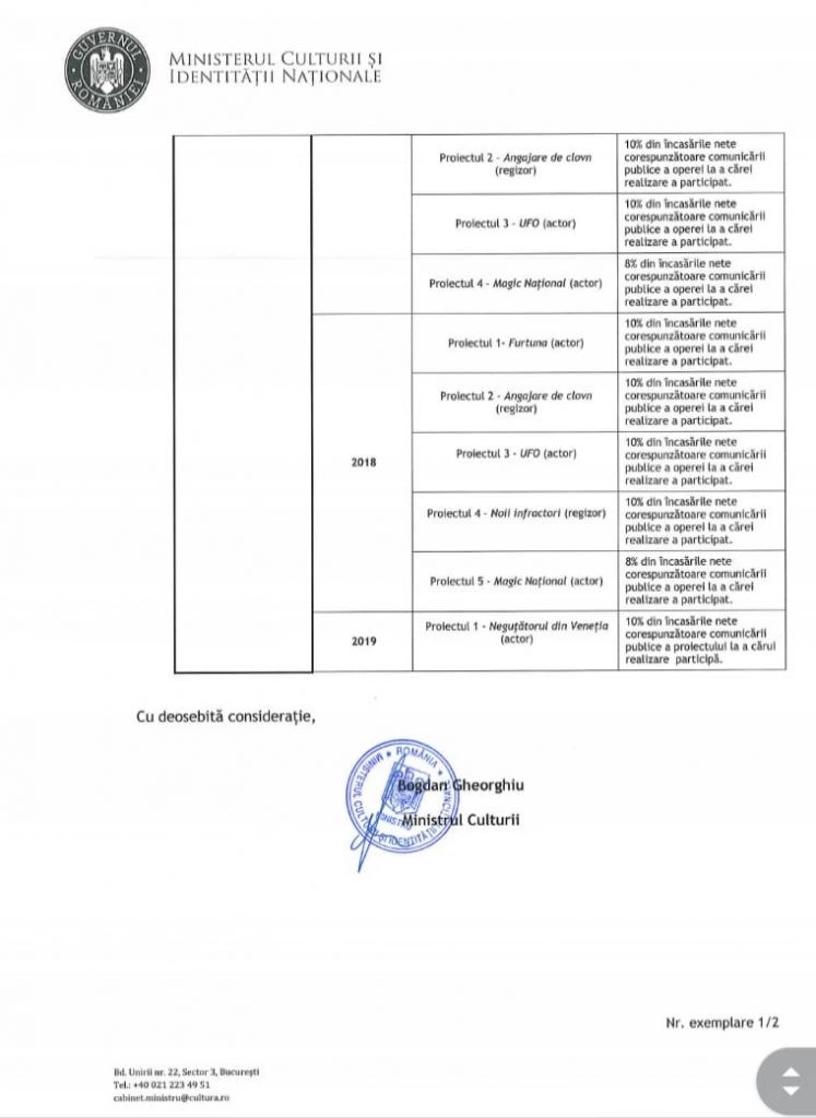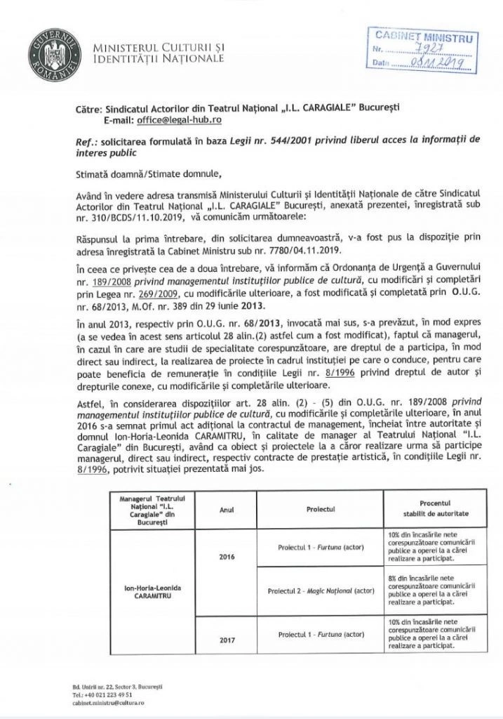 Declarația lui nu corespunde, însă, cu documentele oficiale. În aprilie 2019, Caramitru însuși solicita printr-o adresă trimisă la Ministerul Culturii să primească procente de 10% din încasări pentru 5 spectacole și 8% pentru un alt spectacol. Mai mult decât atât, un răspuns trimis recent de noul ministru al culturii, Bogdan Gheorghiu, către Sindicatul Actorilor, confirmă că între 2016 - 2019, Ion-Horia-Leonida Caramitru a primit 10% (și 8% într-un caz) din încasările tuturor spectacolelor în care a fost implicat ca regizor sau actor.