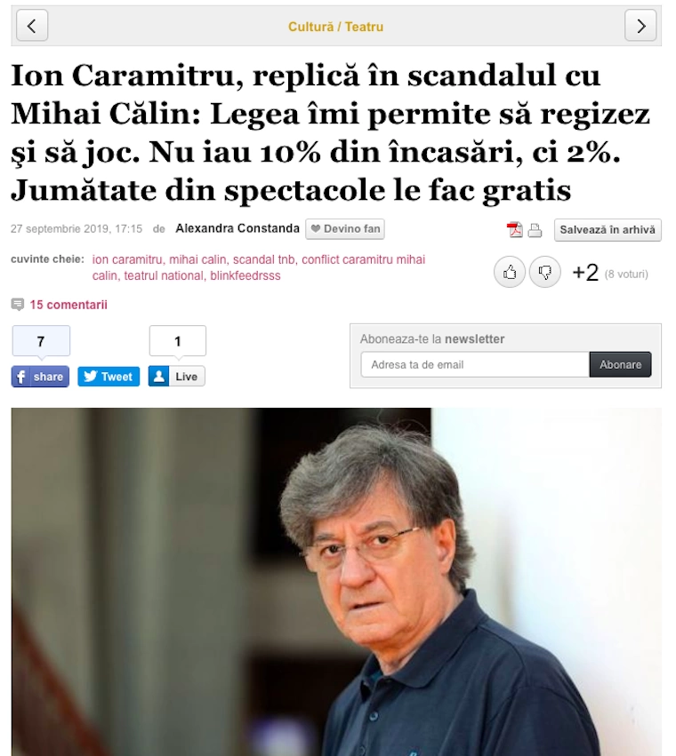 Ceea ce s-a și întâmplat. Ion Caramitru l-a dat în judecată pe actorul Mihai Călin, una dintre vocile care a îndrăznit să vorbescă public despre neregulile din Teatru. Când a fost întrebat de presă de ce și-a trimis în instanță propriul angajat, managerul l-a identificat drept sursa problemelor sale: „L-am dat în judecată pentru ceea ce și-a permis să declare în ultima perioadă, declarații care au dus la un linșaj mediatic pe care nu îl meritam. Presa a preluat declarațiile domniei sale, cumva a culminat cu sesizarea domnului ministru Breaz care a trimis Corpul de Control aici, care două luni m-a controlat, plecând de la declarațiile lui Mișu Călin și care n-au găsit nimic.”