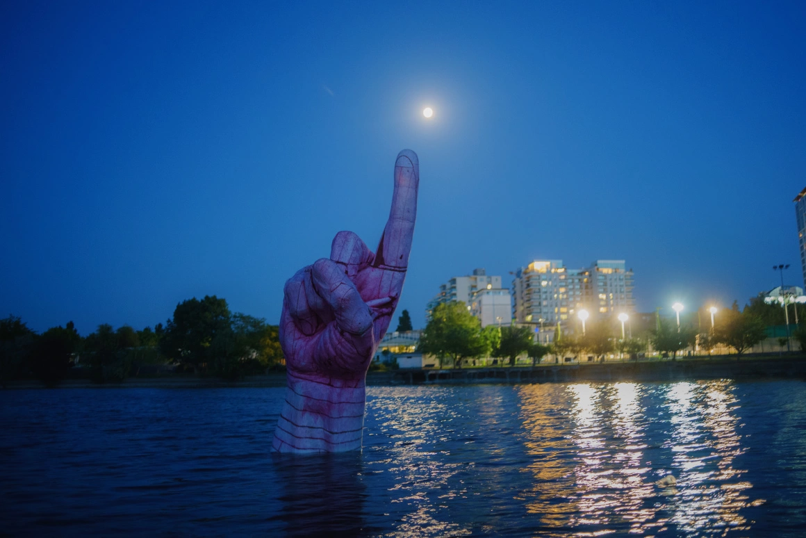 Cătălin Bădărău a expus această mână uriașă acum o lună şi jumătate prin IOMO Gallery la târgul de artă RAD, pe lacul din spatele Hotelului Caro din nordul Bucureştiului. Vizitatorii puteau s-o privească de pe mal. N-au fost, ca noi, atât de aproape de ea, deși sculptorul crede că distanța nu te ține departe de magia ei. „Chiar și de la distanță”, spune el, „tot interacțiune directă e.”