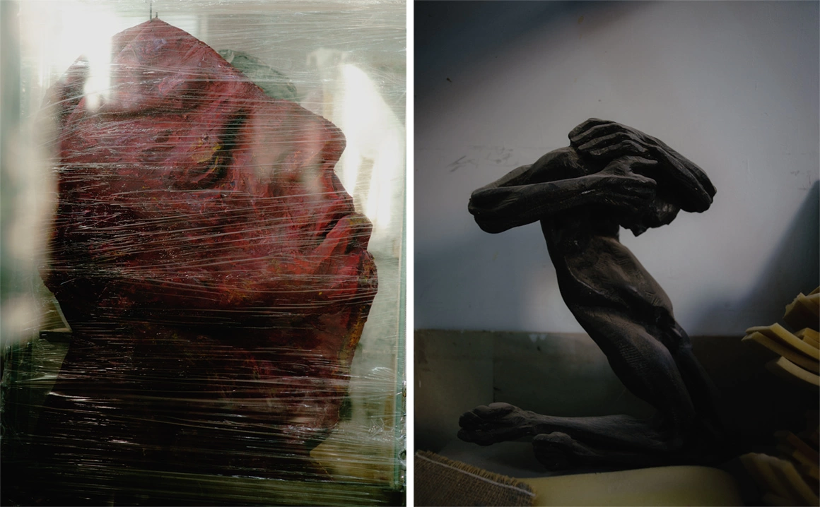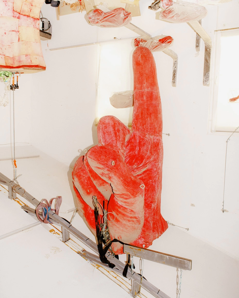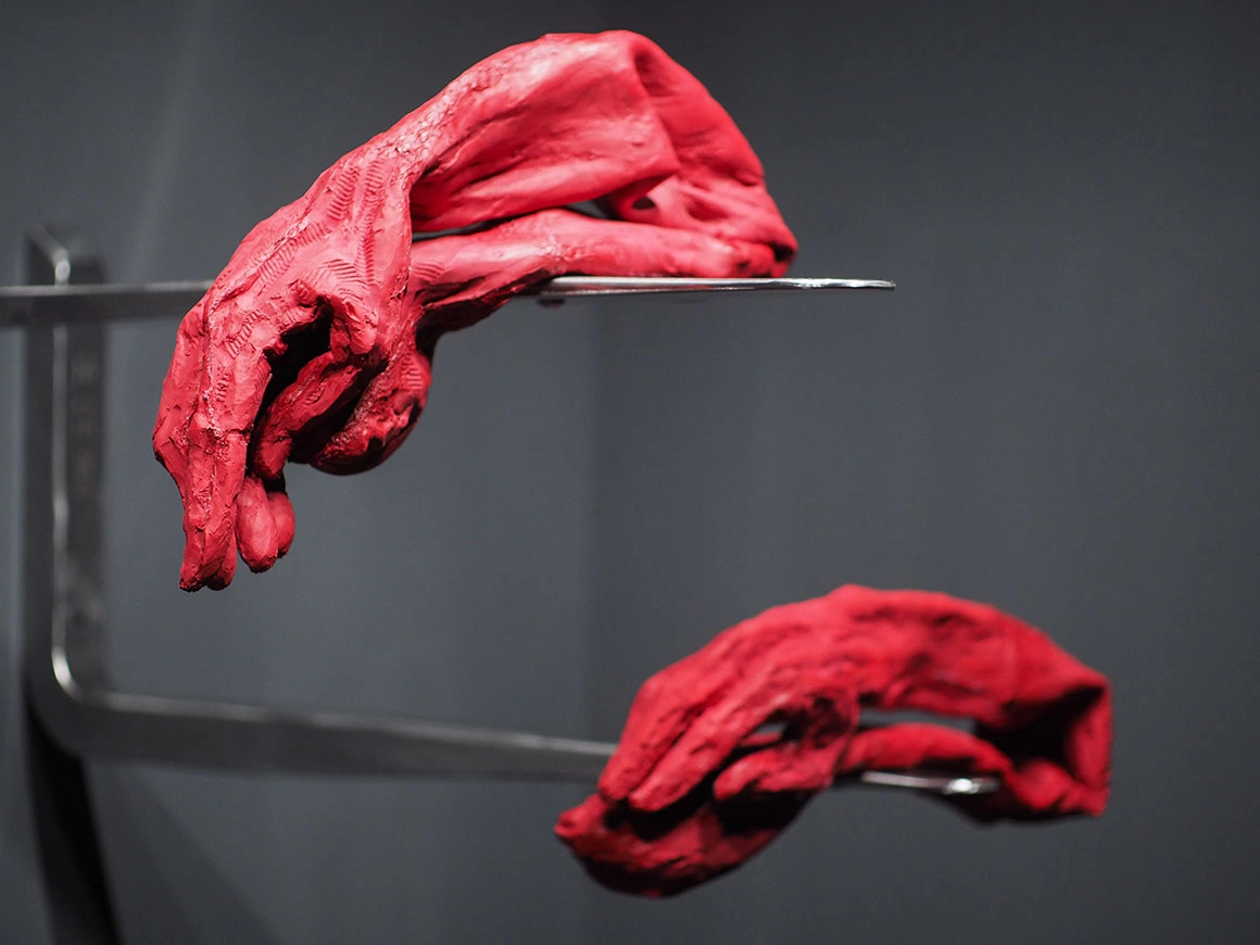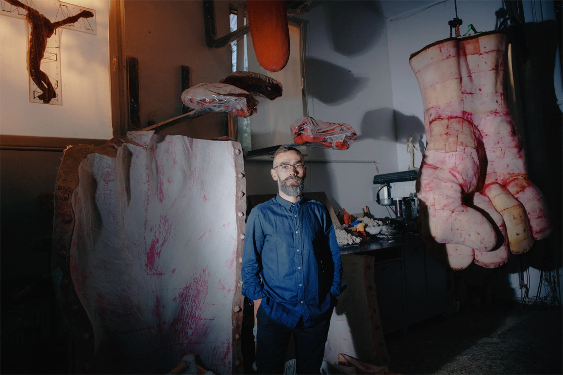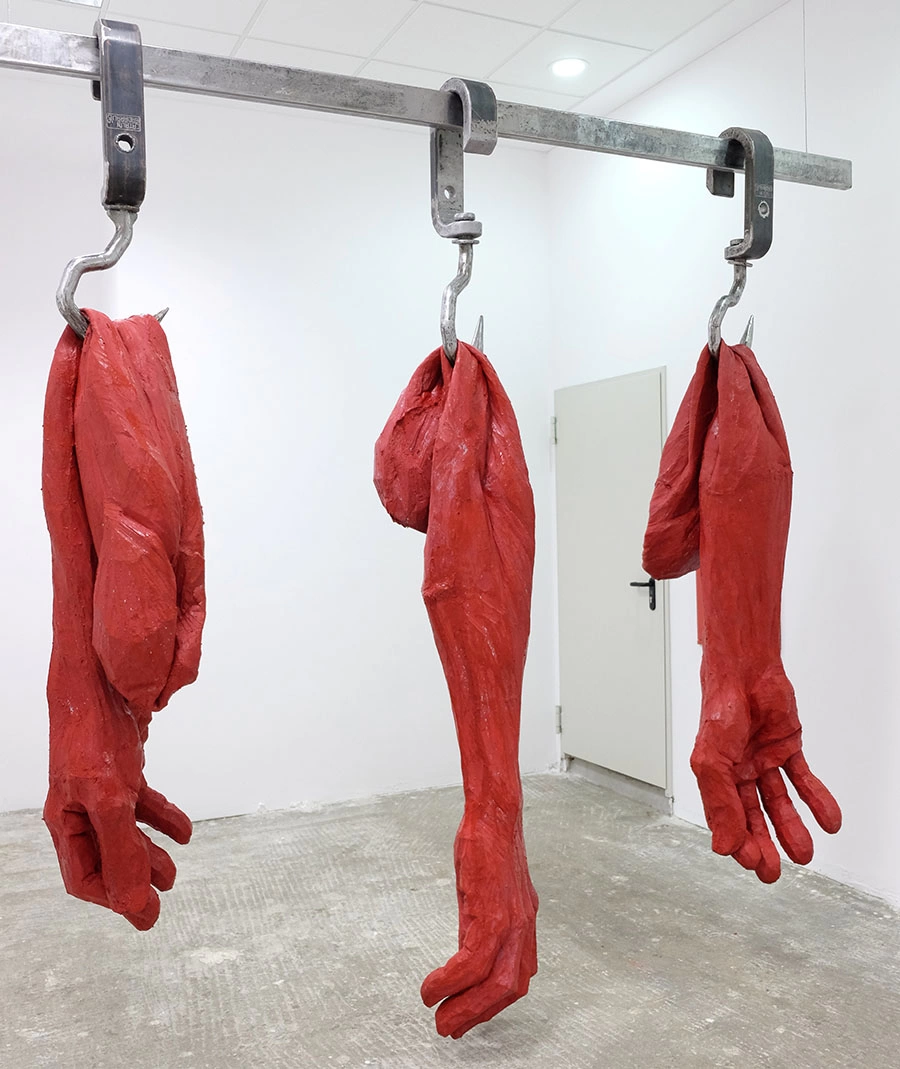 Cu ocazia asta, am explorat puţin interesul pentru mâini al artistului de 43 de ani care predă la Facultatea de Arte Plastice din Bucureşti. L-am vizitat într-un fost atelier auto de la Combinatul Fondului Plastic, pe care l-a transformat în spaţiu de creaţie împreună cu partenera lui. Un loc curat şi ordonat, unde muzica simfonică venită dintr-un laptop îmblânzeşte fundalul dominat de un pumn gigantic, încleştat, şi de o altă mână uriaşă, roşie, cu indexul ridicat, agăţate în cârlige ca nişte carcase de carne într-un abator.