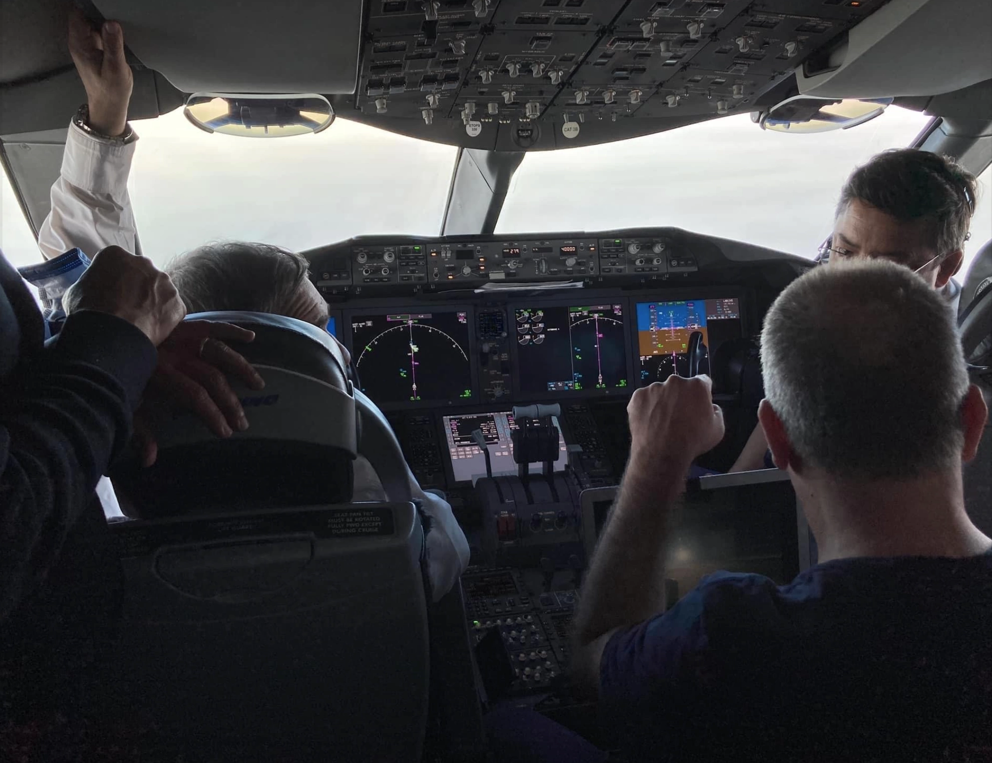 Și organizatorii – o firmă de turism din America specializată în expediții de eclipsă – au găsit repede o soluție, două avioane Dreamliner, Boeing 787, cred că printre cele mai noi avioane puse pe piață, cu niște geamuri cam de trei ori mari față de avioanele cu care trebuia inițial să zburăm. Însă nouă, fotografilor nu prea ne-a convenit acest geam, pentru că este controlat electronic pentru închiderea luminozității și pentru polarizarea și colorizarea luminii.