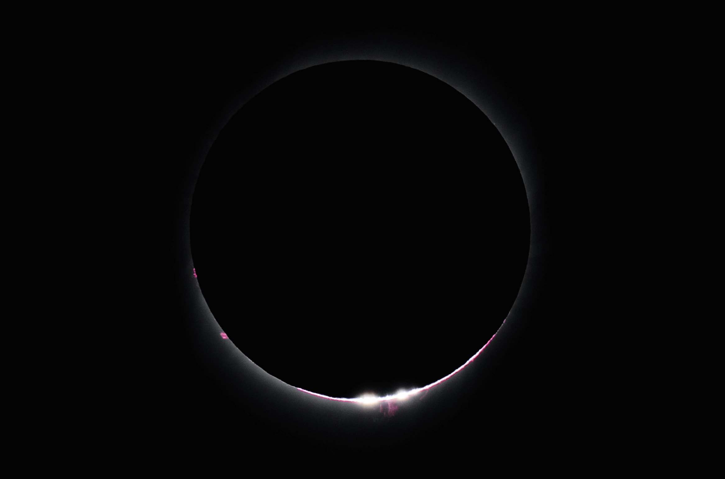După doar câteva secunde de la inelul cu diamant, ultimele raze de Soare trec prin văile lunare, prin văile și mai joase. Și se produce fenomenul de Mărgele ale lui Baily. Francis Baily a fost un astronom englez care le-a observat prima oară la 1836, el le-a descris și sunt foarte spectaculoase, ca niște mingi micuțe de lumină care se preling pe marginea Lunii - marginea Lunii fiind foarte întunecată. Luna este ca o gaură neagră care se așază peste soare și la marginea acestei găuri negre se plimbă niște mărgeluțe de lumină. După care dintr-o dată apare coroana solară. Este atmosfera Soarelui formată din gaze încinse la temperaturi de milioane de grade, iar gazele astea sunt gaze ionizate și transformate în plasmă, este o altă stare a materiei.