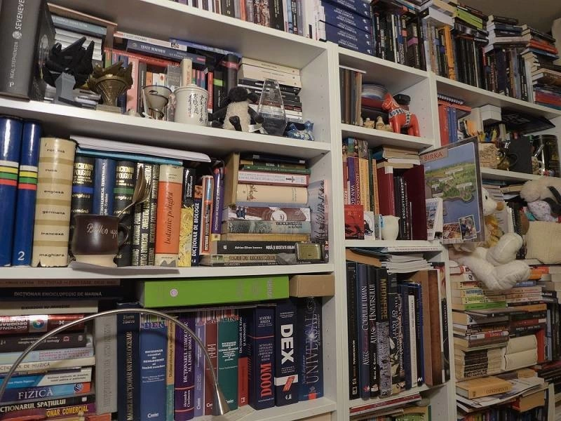 Nu, serios, e o varză cu multe foi vraiște, împănate cu de toate. Prin și printre șiruri, vrafuri, mormane, piramide și catacombe de dicționare, enciclopedii, cărți de popularizare a științei și SF-uri se ascund suveniruri vikinge, jucării de pluș, romane neterminate, hărți și probabil ruleta pe care n-o mai găsesc de ceva vreme – dar lasă, că n-am nevoie de ea, știu exact cît măsoară bucata de perete încă neacoperită și cîte corpuri Billy de la Ikea mai încap acolo (puține rău). În fiecare zi mă întreb dacă n-ar trebui să-mi fac un catalog. Altfel, la ce bun să ai un dicționar poliglot de industrie și tehnologie chimică, dacă nu-l găsești cînd îți trebuie sau uiți că-l ai? Și de ce ți-ai cumpărat Zero de la tîrgul de carte dacă, conform așezării alfabetice de la secțiunea știință, a ajuns pe rîndul din spate și-n consecință ai mai cumpărat-o o dată și de pe net?