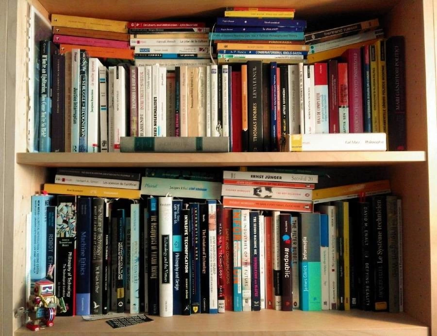 După cum se vede și în imaginea cu rost de sinecdocă, alandala e cel mai bun predicat al bibliotecii, ca extensie a mea și grădină-a desfătării vieții mele. A apărut și crește după interese obsesive și pasiuni trecătoare, după disponibilitate și noroc, după moment și după căutare. Ce se vede e o părticică din două fluxuri permanente de lectură (categoria „cărți-cu-care-te-întâlnești-de-mai-multe-ori-pe-an”), unul de teorie și filosofie politică, altul de etică, tehnologie și medii digitale. Visez la ziua când voi repune în ordine toate fluxurile aducând/adunând cărțile iar împreună. Acum e un haos generativ, sper.