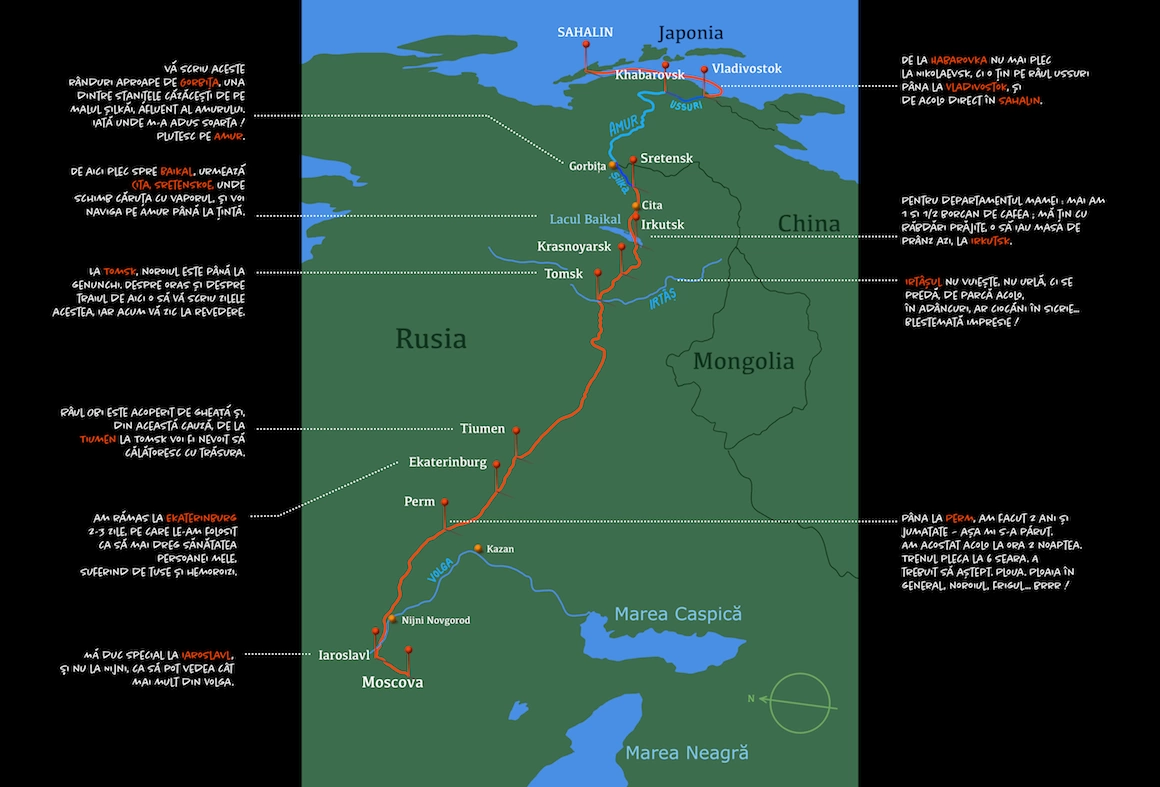 „La Irkutsk ajung peste 5‐6 zile, rămân acolo tot atâtea zile, pe urmă plec spre Sretensk, unde se și încheie drumul meu cu vehicule trase de cai. Iată că se împlinesc mai mult de două săptămâni de când călătoresc fără oprire, gândurile mele merg într‐o singură direcție, cu asta trăiesc; zilnic văd răsăritul soarelui de la început și până la sfârșit. M‐am obișnuit cu felul ăsta de trai, încât mi se pare că toată viața mea n‐am făcut decât să merg cu căruța ori tarantasul și să mă lupt cu drumurile noroioase. Când nu e ploaie și lipsesc gropile pline de noroi, mă simt oarecum ciudat, ba chiar mă plictisesc. Și cât de murdar sunt, și ce mutră respingătoare am! Și cât de roase îmi sunt bietele haine!”