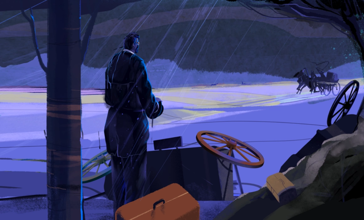 „Și iată‐mă noaptea într‐o izbă, în băltoacă, chiar pe malul Irtâșului, simțind cum umezeala mi‐a pătruns în tot corpul, mă simt singur, ascult cum Irtâșul meu ciocănește în sicrie, cum urlă vântul, și mă întreb: Unde mă aflu? Ce caut aici? În odaia de alături, dorm mujicii – și chirigiul meu. Sunt niște oameni de treabă. Că dacă erau răi, puteau foarte bine să mă jefuiască și să mă arunce în Irtâș. Este singura izbă de pe mal, martori nu sunt...”