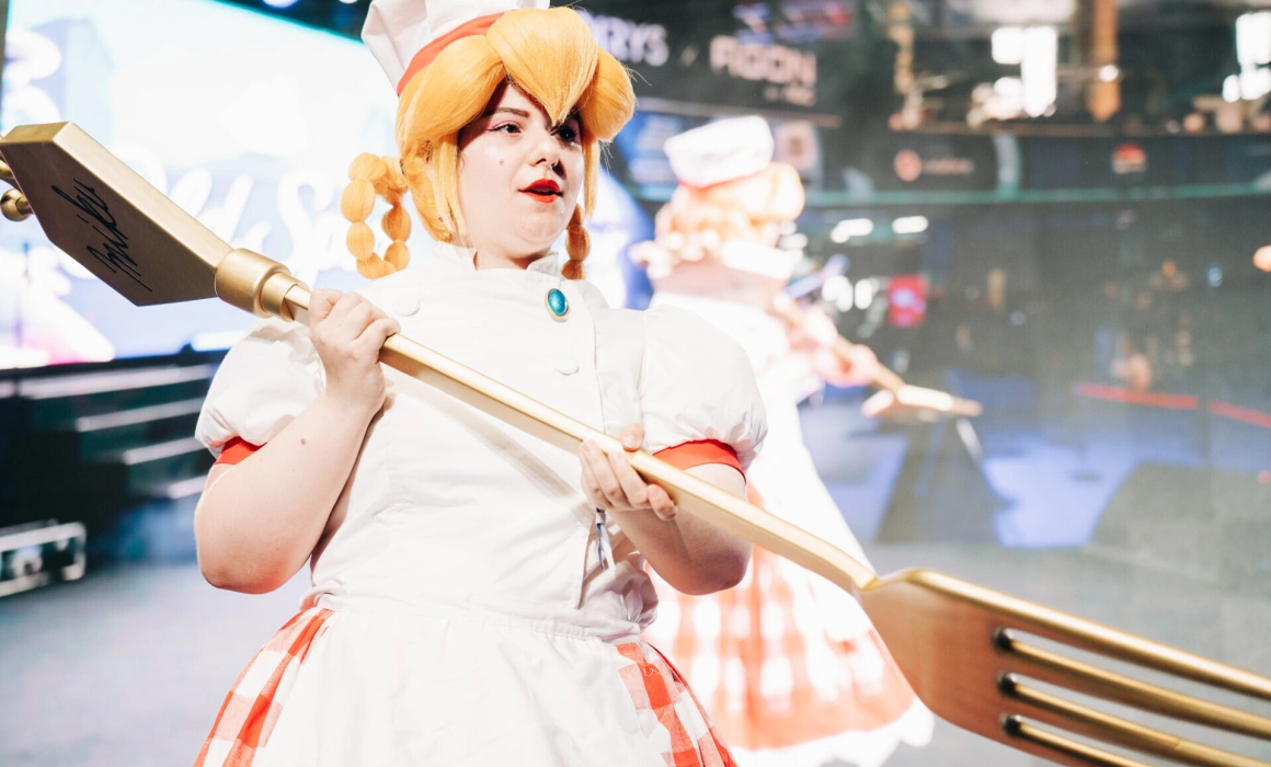 O patiseră cu părul prins în două cozi spiralate, bonetă albă de bucătar și o furculiță aurie uriașă sprijinită pe umăr – cu care a câștigat premii internaționale – atrage privirile celor din jur. Fusta în carouri roșii și albul imaculat al uniformei par desprinse dintr-un desen animat, dar ținuta e reală, cusută cu mâinile ei, gândită în cele mai mici detalii. Pe scenă, e Patissiere Peach, personaj din jocul „Princess Peach: Showtime!”. În culise, e Ștefania – sau Lyra, cum o cunoaște comunitatea cosplay din România.