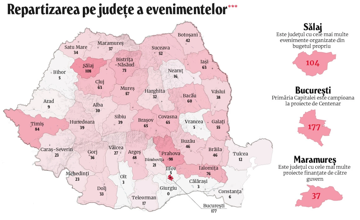 Cum arată însă peisajul complet al Centenarului românesc, dincolo de mici evenimente anecdotice, de poleieli provinciale și de discursuri încărcate de emoție? Am încercat să croim o imagine cât mai completă, așa că am pus aceleași două întrebări celor 41 de consilii județene și Consiliului General al Municipiului București: