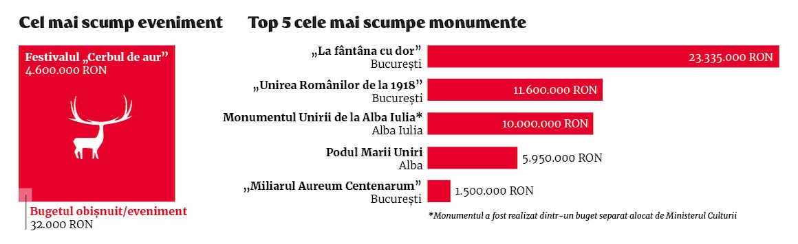 Pe lângă proiectele finanțate din bugetele locale, Guvernul a alocat 100 de milioane de lei pentru evenimente și monumente dedicate Centenarului și le-a împărțit cu generozitate de-a lungul a patru sesiuni de finanțare. Au fost, cu totul, 738 de proiecte. Din fondurile de la bugetul central, 90.000 de lei au fost folosiți pentru susținerea unui eveniment intitulat „Centenarul în Jilava”, iar 310.000 de lei s-au dus pe spectacolul „Jandarmeria Centenară”, la care au participat actorul Dan Puric și preotul Constantin Necula. „Am băgat cultura în dubă”, aveau să se laude mai târziu reprezentanții Jandarmeriei pe Facebook.