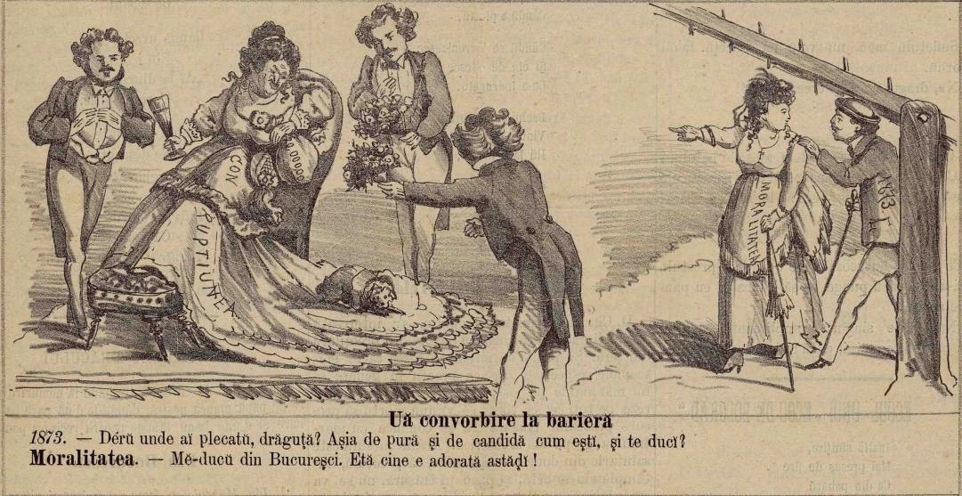 „Iată cine e adorată astăzi!” – spune o tânără Moralitate, indicând o mai coaptă Corupție tânărului An 1873, într-o caricatură din acel ianuarie, la bariera Bucureștilor.