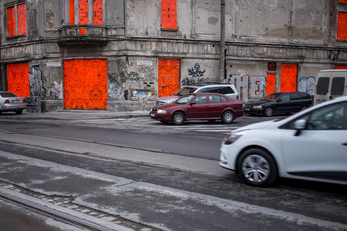 Cinematograful Marconi este singurul rămas în picioare în zonă, din cele șase răsfirate în zona Gării de Nord până în anii ‘90. Deschis în 1930, cinematograful a avut o istorie lungă și complicată, care a reflectat toate transformările prin care a trecut România în ultimul secol. Dacă primul nume i-a fost dat în memoria lui Guglielmo Marconi, fizician italian recompensat ăn 1909 cu Nobelul pentru Fizică, în urma contribuției lui la dezvoltarea telegrafiei fără fir, în primii ani de comunism, a fost rebotezat Cinema Popov. Rusul Alexander Stepanovici Popov a fost, la rândul lui fizician, e considerat inventatorul radioului, iar munca lui s-a bazat mult pe descoperirile anterioare ale lui Marconi. Apoi, în anii '60, Cinema Popov, fost Cinema Marconi, a devenit Cinema Dacia, pentru ca imediat după Revoluție, clădirea să fie scoasă din uz. Încet-încet, a devenit ruină și, chiar dacă în 2006 a fost retrocedat, monumentul istoric rămâne până azi o relicvă. Așa că, până la demolarea sau renovarea lui, panourile portocalii, pe care tronează personajele Pisicii Pătrate, și care mai că seamănă cu autocolantele ambulanțelor, vor sta acolo, ca un reminder a ce a fost, ce ar fi putut să fie și, desigur, a ceea ce e, acum, clădirea-monument. Iar autorul lor ne-a zis câteva cuvinte despre proiect.