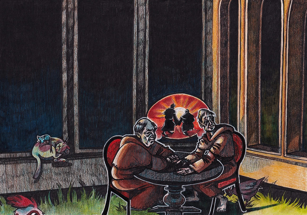 Era, din nou, vocea lui Marius Ianuș. Însă călugării aveau deja mâinile la ochi și le era greu să-și acopere cu ele și urechile, așa că încercau să-și folosească umerii, creând impresia că ridică din umeri, ca și cum erau frământați de o întrebare la care nu aveau răspuns.