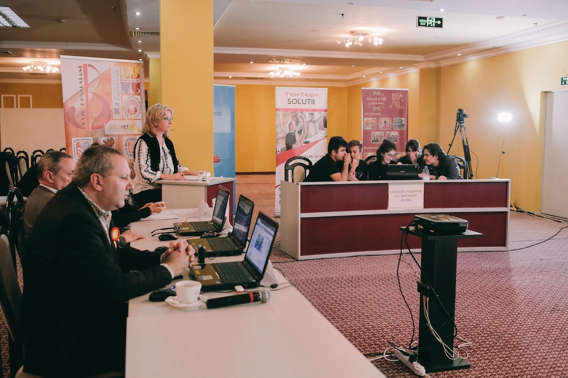 Intrăm într-o clădire cu trei etaje, un fel de magazinul Obor, doar că ceva mai mic. Confruntarea între Colegiul Național „I.C. Brătianu” din Hațeg și Colegiul Național „Mihai Eminescu” din Petroșani se ține într-o sală de conferințe, care e aproape goală la ora aia (pentru liceele care nu sunt din Deva, e mai complicat să vină cu galeria după ei). Pe peretele din față - acoperit de o proiecție tricoloră - se află un ecran pe care sunt afișate întrebările grilă. De o parte și de alta sunt mesele la care stau concurenții (câte cinci în fiecare echipă), iar la masa din mijloc, cu spatele la noi, stă comisia, ca la un centru de comandă: câteva doamne în ie și niște domni în costum, cu cocarde la piept. După fiecare întrebare, elevii se consultă între ei, iar în fundal se aud aud niște ritmuri molcome, o combinație între Jean-Michel Jarre și muzică de lift. Dacă îi urmărești atent, observi că ambele echipe au mici coduri și că știu cum să comunice prin gesturi și priviri. Când apare câte o întrebare ceva mai ușoară (chestie rară, de altfel), își zâmbesc și nici măcar nu se mai uită unii la alții. Ceva de genul: un fleac, i-am ciuruit.
