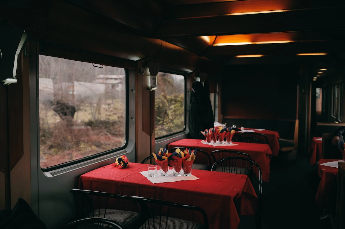 Vagonul restaurant din trenul care merge spre Viena are două încăperi: un fel de bistro, cu mese înalte, și, în spate, restaurantul propriu-zis, cu fețe de masă roșii și mese încărcate cu șervețele în culorile tricolorului. În vagonul unde avem locuri nu există prize și e îngrozitor de cald, așa că ne retragem aici, unde trebuie să facem consumație timp de vreo opt ore, cât durează să ajungem de la București la Deva. Până la Viena se fac vreo 18 ore, adică exact ca în perioada interbelică, când existau locomotive care atingeau și 110 km/h. Până la urmă, e și ăsta un mod de a sărbători centenarul: să călătorești în condițiile de acum un secol.