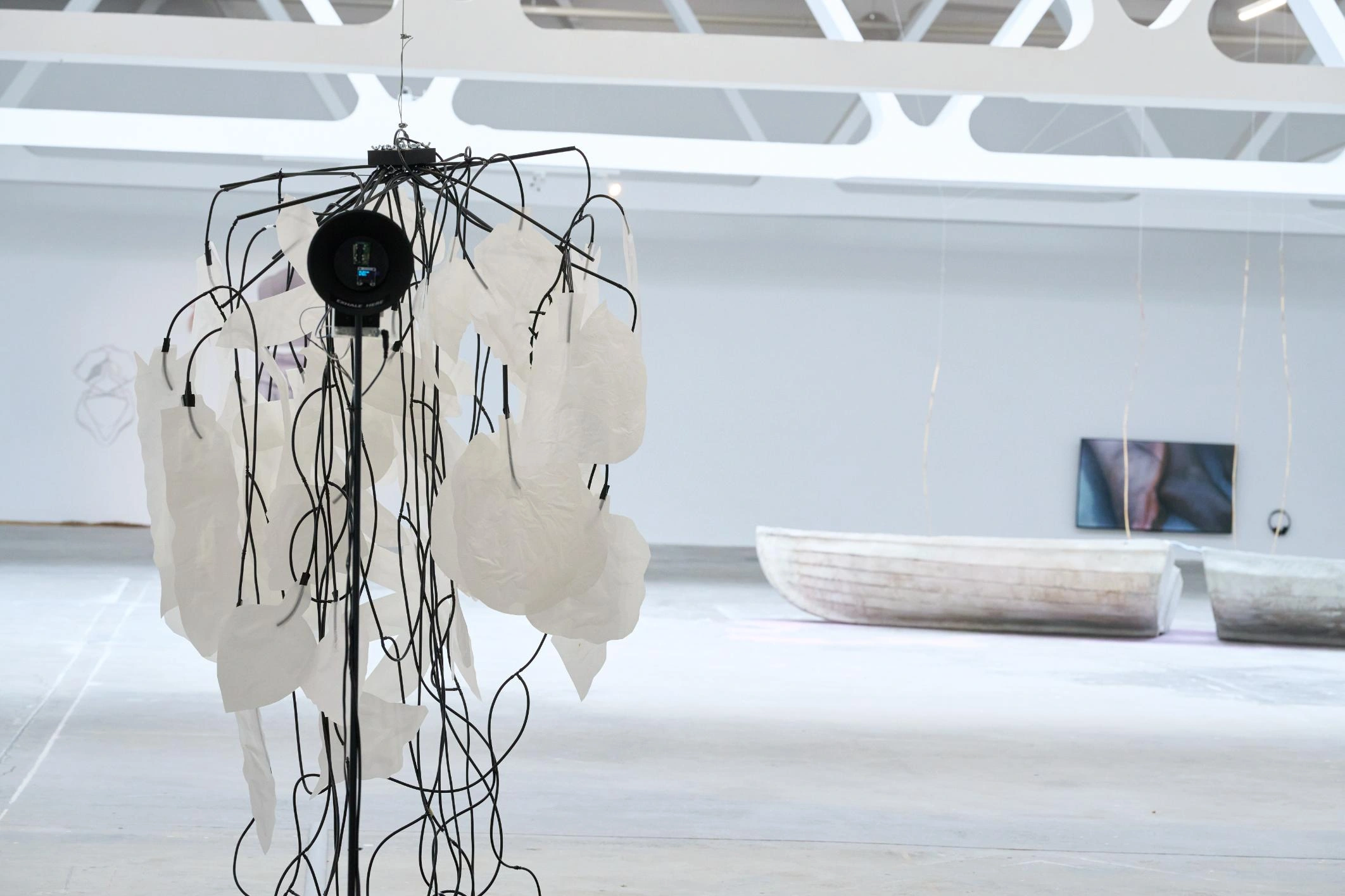 Cu Floriama Cândea am mai lucrat de-a lungul timpului. În 2022 am fost pentru prima dată în vizită la ea la studio și a fost fascinant să o aud vorbind și să văd toate obiectele, cum le leagă între ele. Pentru lucrarea din expoziția de la Kunsthalle a fost într-o rezidență în Delta Dunării, unde a văzut respirația ca pe un act de reciprocitate. Vorbind și cu mai mulți biologi, a înțeles mai bine care este rolul fiecărei plante în ecosistemul foarte vast din deltă. Vrea să-și continue research-ul pentru a dezvolta o lucrare mai mare, la anul. Lucrarea de la Kunsthalle e interactivă, se activează odată cu respirația. Este vorba despre o instalație cu brațe asemănătoare unor petale, care în momentul în care un vizitator suflă într-un recipient special încep să se deschidă.
