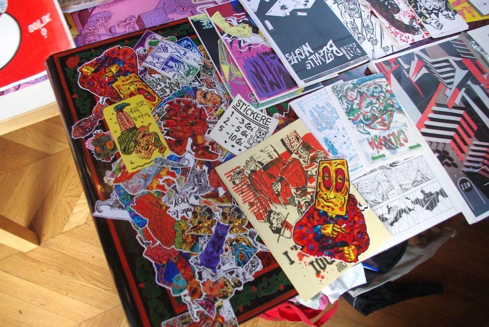 Kitra știe clar că lumea n-o să se îngrămădească la desene, dacă nu fac artiștii pe dracu-n patru ca să iasă nițel în față. „Trebuie să creștem o cultură, prin evenimente și expoziții”. Până una-alta, a vândut azi și printuri, și tricouri. În jur, vizitatorii scotocesc prin mormane de stickere cu personaje cu cap pătrat care fumează și pisici mov. Afară nu mai plouă, iar culorile și liniile dinăuntru se încheagă într-un desen mai mare decât cămăruța asta. Pereții lumii ar fi mai suportabili dacă ar găzdui ilustrații.