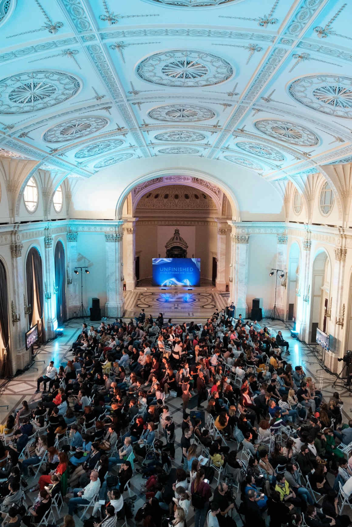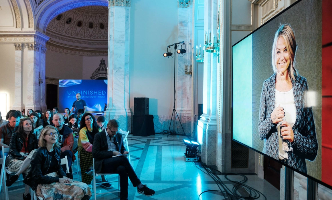 Fotografia principală: Conferința lui Esther Perel la Unfinished 2018, proiectată în direct în Sala Tronului de la Muzeul Național de Artă al României. Foto via Facebook/Unfinished