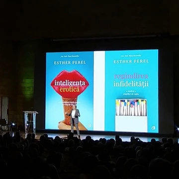 Însă pentru că i-am citit cărțile, traduse și la noi (Inteligența erotică și Regândirea infidelității) și i-am devorat podcastul, al cărui fiecare episod e un fel de ședință deschisă de terapie de cuplu, m-am dus s-o ascult și la Unfinished. Mă așteptam să-i văd discursurile de la TED, care au adunat peste 20 de milioane de vizualizări până acum - aduse la zi, reconfigurate, dar reciclate. Ce am văzut a fost o ședință de terapie de grup, cu câteva sute de oameni în sala arhiplină în care a avut loc conferința propriu-zis și alte câteva sute, în sala unde s-a proiectat evenimentul, pentru cei (mai mulți) care n-au mai prins loc în sală. Prezentatorul american a contribuit la așteptări, schițându-i portretul lui Perel în câteva tușe strălucitoare: vorbește fluent 9 limbi, discursurile ei de la TED au adunat peste 20 de milioane de vizualizări până la ora actuală, Regândirea infidelității s-a tradus în 25 de limbi străine, „mai multe, chiar, decât vorbește Esther”.
