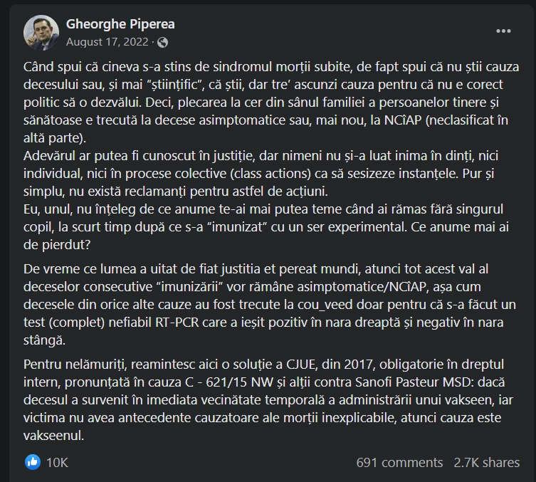 În octombrie 2021 devine virală o postare care susține că decesele din urma vaccinului sunt ascunse prin trecerea „morții subite” drept cauză.