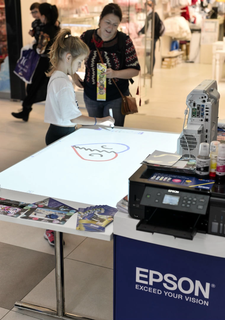 Un pic mai încolo, Epson a venit cu un videoproiector interactiv, care înregistrează tot ce desenezi pe masă. Dup-aia, îți poți tipări opera de artă la imprimanta lor sau ți-o poți transfera pe USB sau prin Wi-Fi.