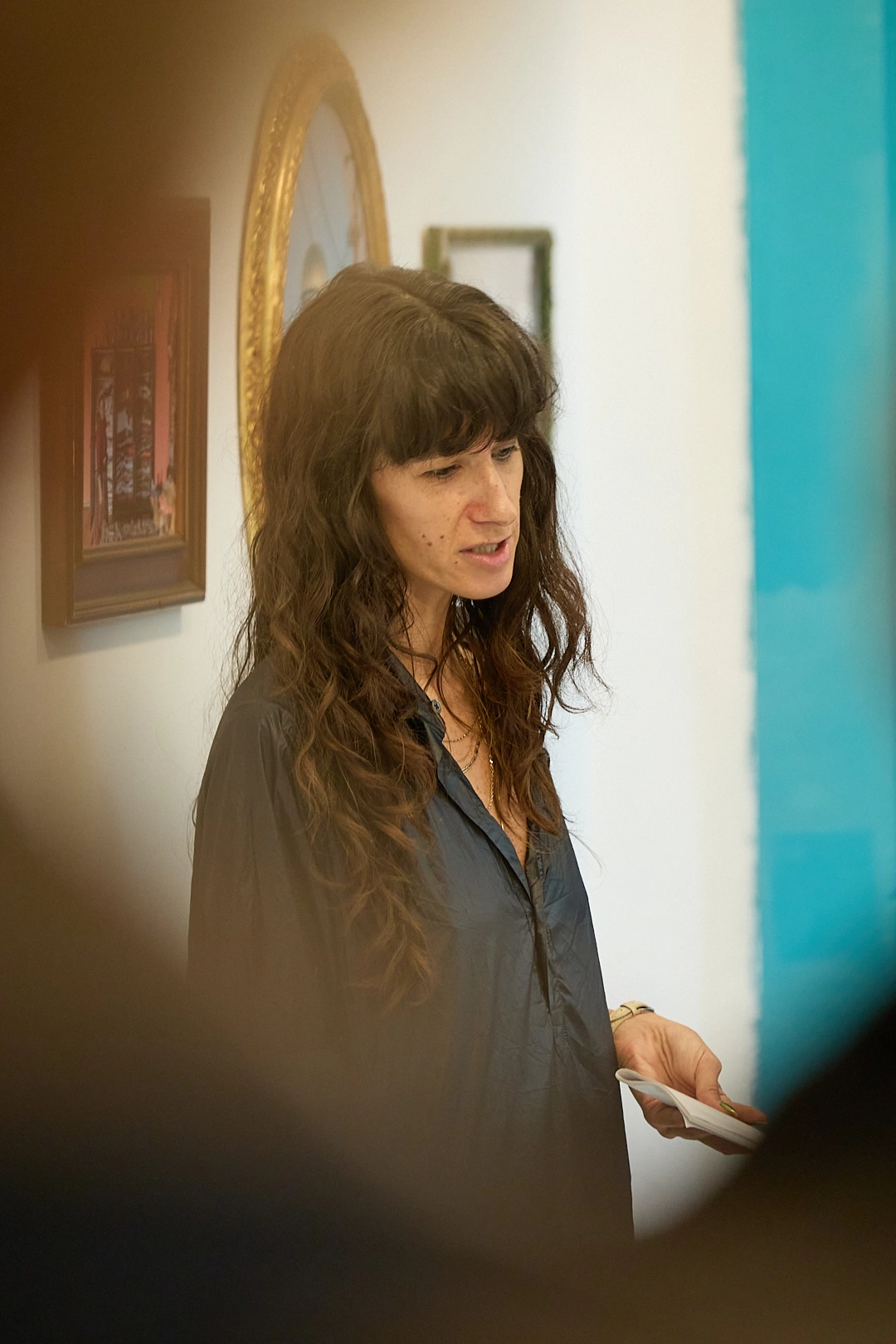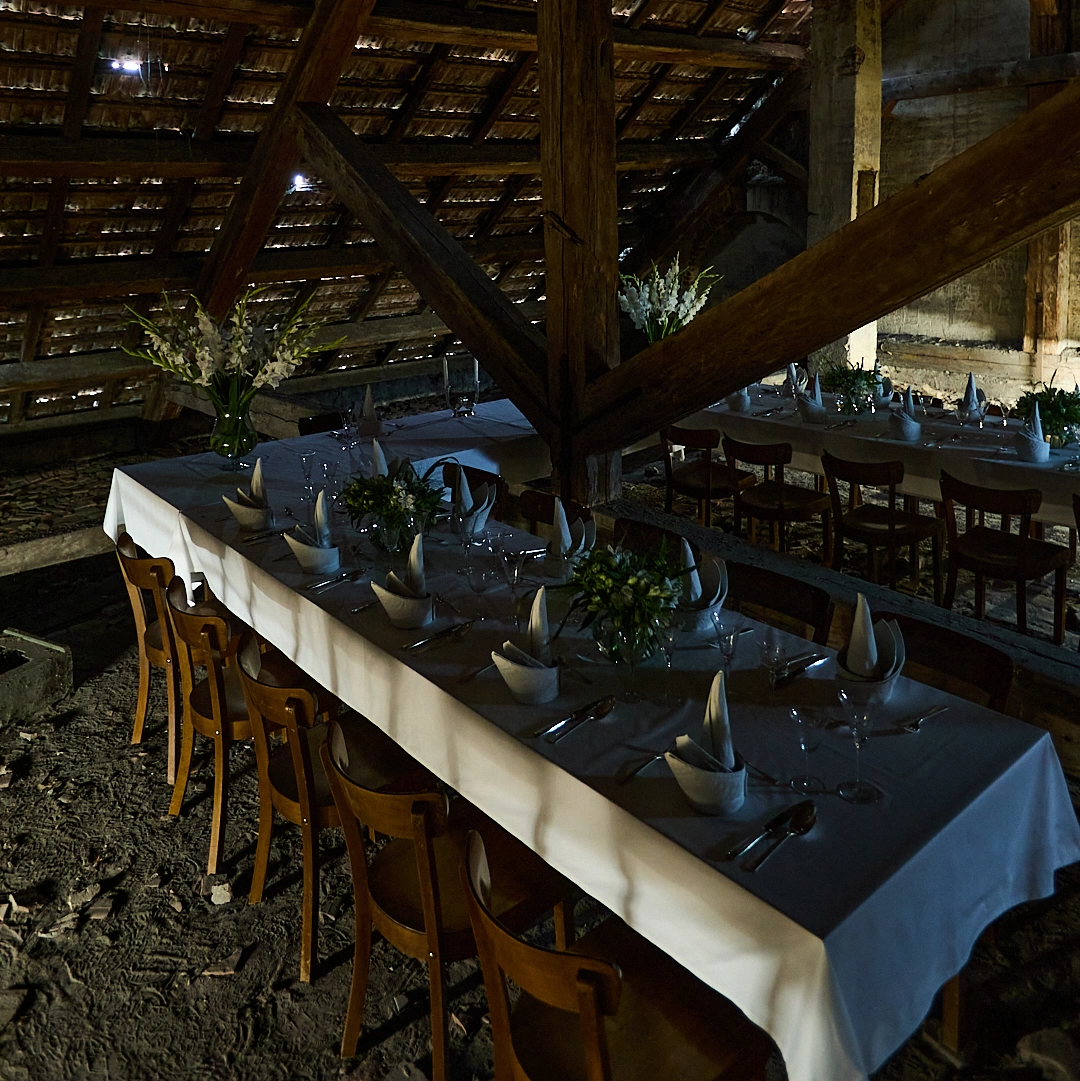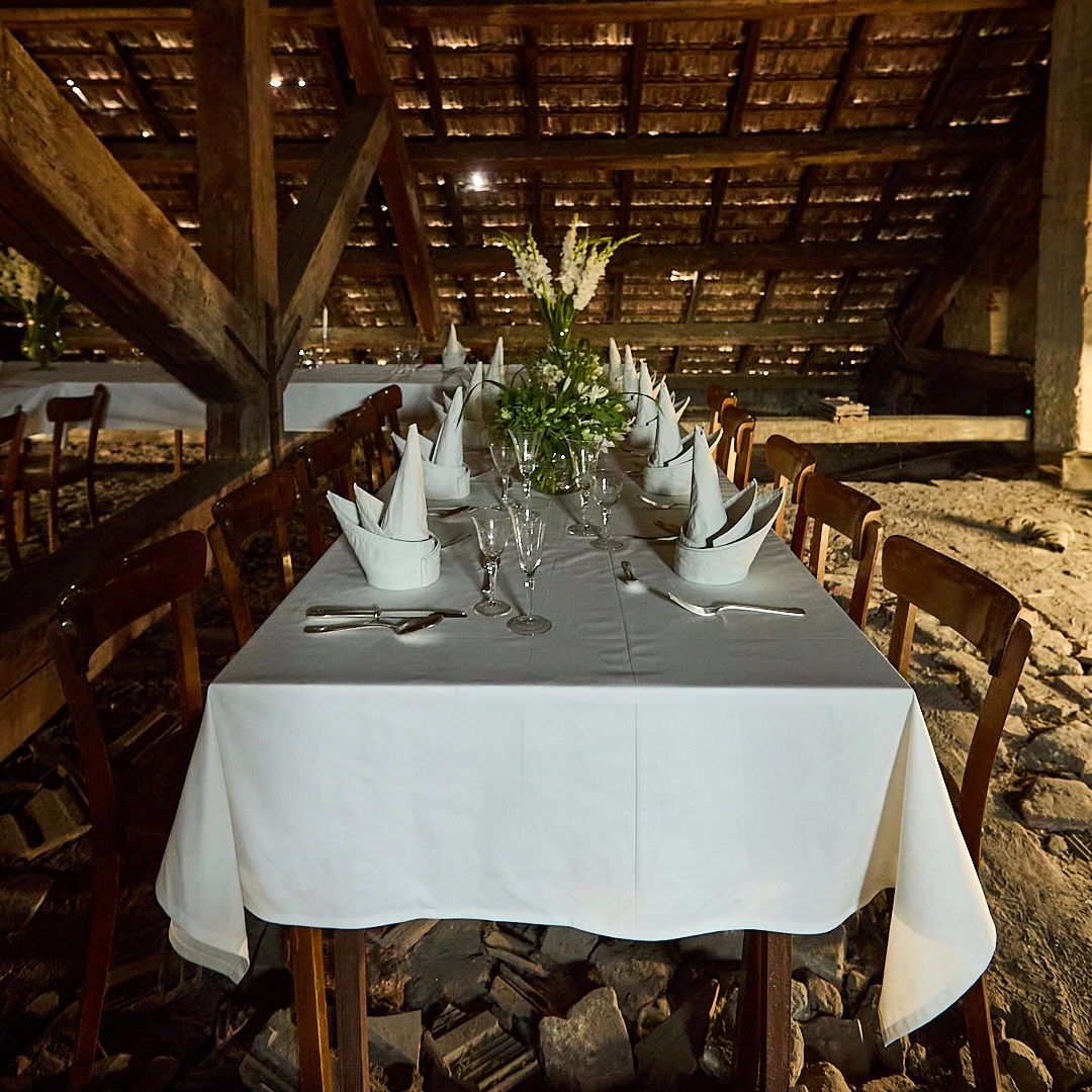 Pentru expoziția sa Open Doors din 2023, Berlin, Friedemann a pictat o pânză de mari dimensiuni cu culori de apă, care reprezenta masa de nuntă a bunicilor săi, din anul 1949. Pictura se intitula Fest, 1949 și reprezenta o masă ceremonială care apare într-o stare de așteptare sau de repaus, creând o senzație de anticipare (Vorfreunde) sau premoniție (Vorahnung). Pentru cover me softly, Friedemann Heckel a construit varianta tridimensională a acelei mese festive, și nu oriunde, ci chiar în podul clădirii Garnizoanei, la care ajungi după aproape turul complet al celorlalte secțiuni expoziționale. Un spațiu absolut special, care te face să te oprești și să observi o realitate înghețată în timp, undeva în Germania post-război, împărtășind o memorie colectivă greu încă greu de procesat. Instalația înglobează un mix de elemente, unul mai intrigant decât altul: 22 de pahare de vin, 22 de pahare șampanie, 22 de șervețele realizate din porțelan (ca niște bibelouri suprarealiste), 22 de cuțite, 22 de furculițe, 22 de linguri, 22 de lingurițe, 22 de scaune, trei mese, trei fețe de masă, patru boluri, două vaze, flori tratate special pentru a rezista o perioadă îndelungată (un fel de împăiere – a povestit puțin artistul prezent la deschidere despre asta). Și, da, am rămas puțin suspendată în acea imagine. Ceva din memoria mea postcomunistă recunoștea câteva dintre acele elemente, iar gladiolele albe, acum împăiate, păreau ceva parcă extrapolat dintr-un timp cuantic. Care îmi era familiar. Și mă acoperea cu o nostalgie bizară.