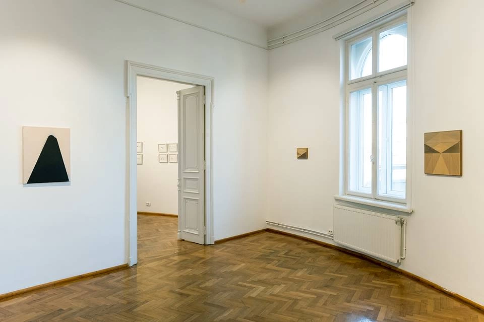 La fel stau lucrurile și în cazul altor lucrări din expoziție, cum e pictura Svenjei Deininger, în imaginea de mai sus în partea dreaptă. Avem aici un triunghi negru, cu vârful rotunjit, pictat pe pânza brută, fără grund. Iar în colțul imaginii din dreapta, atât de mic că nu se vede în fotografia de mai sus, acest triunghi se termină, către marginea picturii, pe o suprafață de maxim 10 x 10 centimetri, cu o porțiune de imagine care a fost trecută prin toată seria de operații specifice picturii de șevalet. Suprafața a fost grunduită cu alb, apoi a fost pictat un fundal, apoi a fost făcută o pictură de suprafață, încât colțul picturii iese în relief pe pânză, din cauza straturilor succesive de vopsea. Imaginea de ansamblu rămâne coerentă, iar triunghiul negru se continuă, neîntrerupt, către margine.