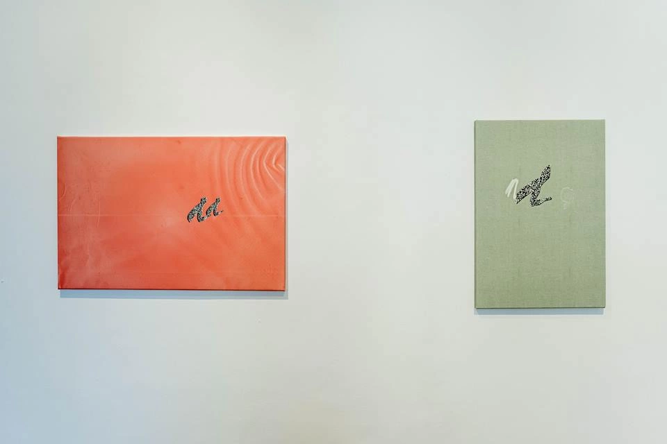 În imaginea de sus, două pânze pe care sunt printate digital imaginile colorate, care conțin și niște ideograme. Nu e nici doar pictură, nici doar fotografie, nici doar print. Dar nu e nici un amestec lipsit de înțeles. Vedem istoria picturii ca mediu venind în contact cu tehnicile contemporane de producție de imagini, cât și capacitatea acestor medii – pictura, fotografia, printul – de a se imita unele pe altele, până în punctul în care vizitatorul citește eticheta sau privește mai atent suportul și înțelege ce materiale și ce tehnici vede, de fapt.