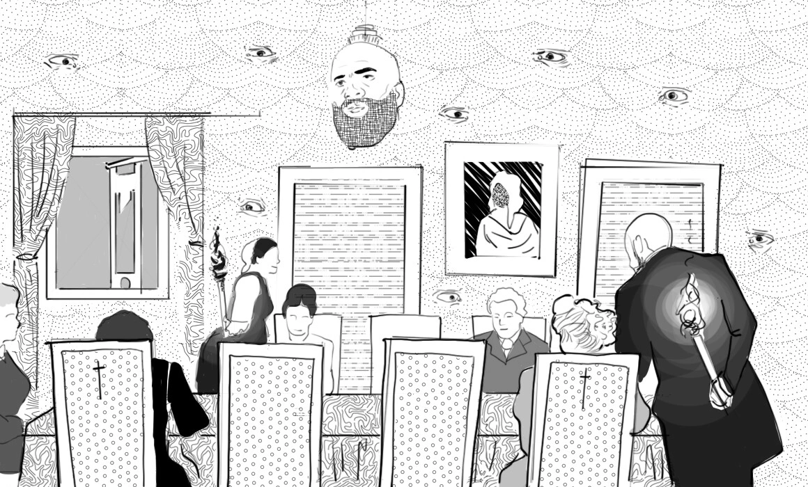 În afară de aristocrați, în conac își face simțită prezența și ajutorul domestic, tăcut și oarecum conspirativ, lipsind totuși din textul lui Soloviov, servind mâncare și băutură și în general având grijă de nevoile conacului, astfel încât cei cinci să se poată dedica exclusiv dialogurilor filosofice, singurul lucru pe care-l fac (sau sunt lăsați să-l facă), de parcă ar ispăși o pedeapsă despre care nu ni se spune nimic, iar servitorii ar fi temnicerii lor. Ghiftuindu-i și dându-le să bea, ca unor condamnați la moarte care ar urma să fie executați ziua următoare. De fapt, ajutorul domestic pare proprietarul adevărat al conacului. Cei cinci se tem de proximitatea servitorilor, ca de niște torționari a căror metodă preferată de tortură e să le întrerupă dialogurile. Madeleine, mai ales, îi aruncă majordomului István priviri pline de panică. Poate pentru că li se aduce aminte că sunt un corp străin în organismul conacului. Infernul nu sunt ceilalți, ca-n piesa lui Sartre, ci cei de care depinzi. Dar ce reprezintă, de fapt, ajutorul domestic în viziunea lui Cristi Puiu? Lucrurile care contează sunt cele care nu sunt spuse, ci ascunse în spatele tăcerilor, al privirilor pline de reproș sau al ridicărilor din sprâncene. Există un dialog în spatele dialogului, pe tot parcursul filmului, și pe care trebuie mereu să-l ghicești. Un dialog purtat între regizor și public. Și care e foarte fascist, când nu e doar vag fascist. De ce se tem cei cinci aristocrați? Răspunsul mi-a venit după ce luasem o pauză de la film, care are o durată de 3 ore și 20 de minute, ca să mă joc Critters for Sale, pe care vi-l recomand, un joc în care apare la un moment dat Stefan Burnett, cunoscut și sub numele de MC Ride, frontman-ul de la trupa experimentală de hip hop Death Grips. Da, MC Ride strigând într-o mașină coruptă de zgomot alb It goes, it goes, it goes, it goes It goes, it goes, it goes, it goes Guillotine yah m-a făcut să înțeleg de ce aristocrații se uită așa urât la ajutorul domestic. Se tem de ghilotină.