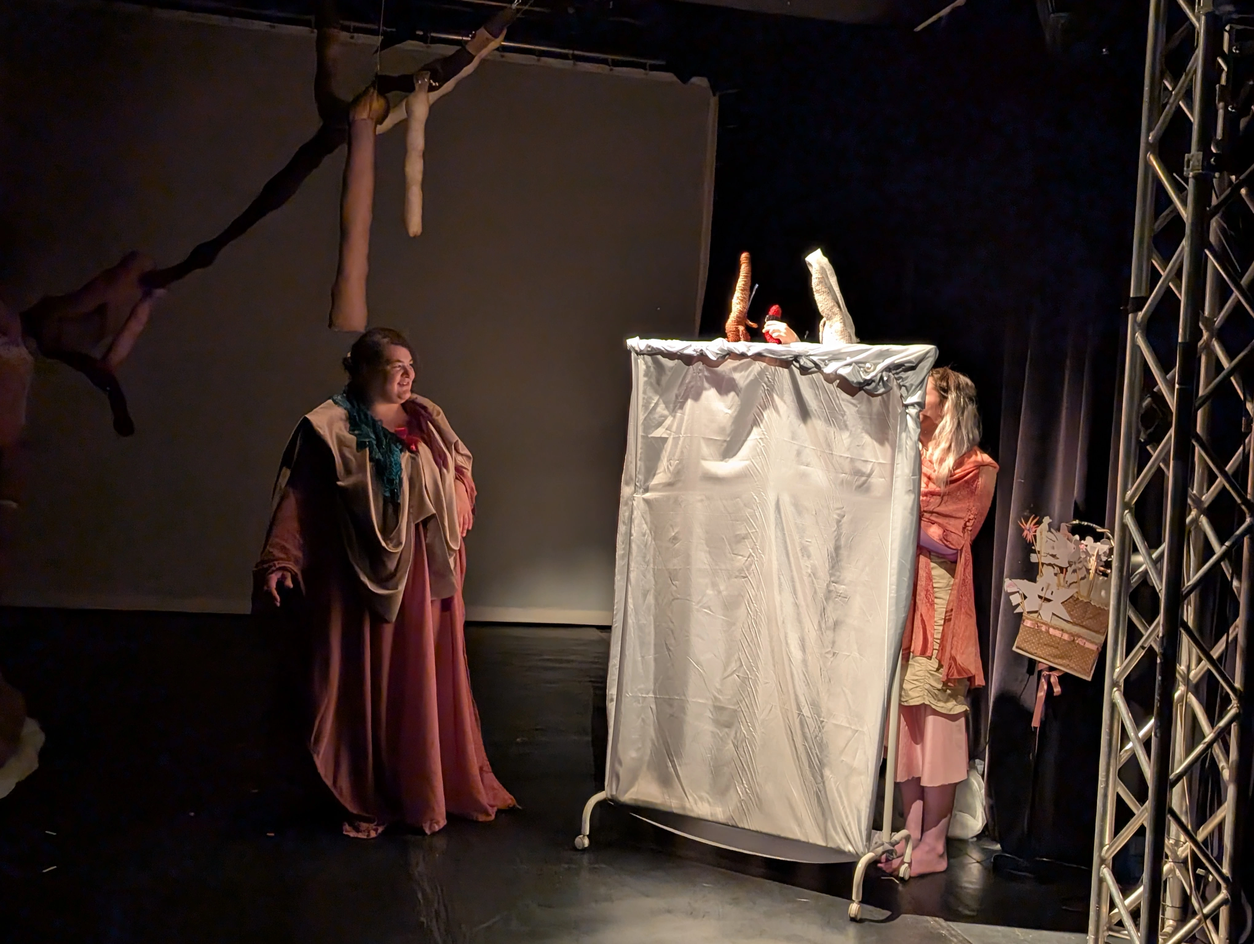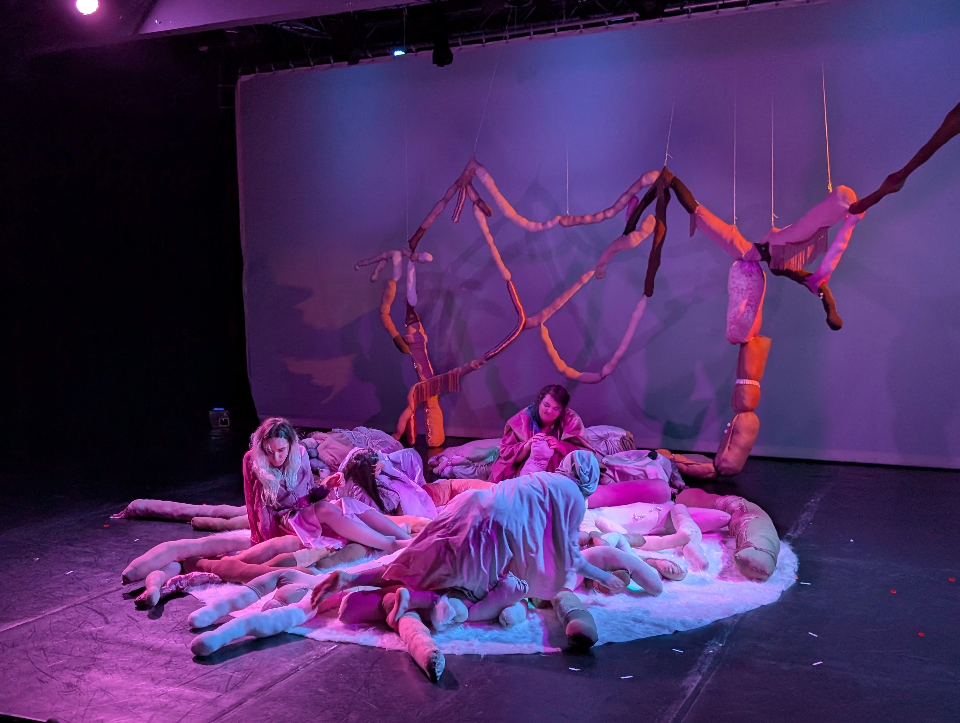 Însă cele trei personaje care vin să se adăpostească în miceliu nu sunt nici ele tocmai ființe umane, ci mai degrabă niște hibrizi, combinând caracteristici de ființe umane sau non-umane cu caracteristici de entități politice sau fantastice. Transparazitul, interpretat de Una Toma, este o entitate nenăscută, care trăiește în interiorul unui corp de bărbat trans și este rodul transfobiei și al accesibilității reduse la avort din societatea contemporană. El nu este, însă, un parazit care își spoliază gazda de resurse, ci, dimpotrivă, absoarbe suferința din corp și o transformă în furie, în energie necesară luptei. Asta e una dintre imaginile piesei care a rămas cu mine și încă îmi reverberează în minte, ca o lumină care tot crește și îmi dezvăluie nuanțe noi.