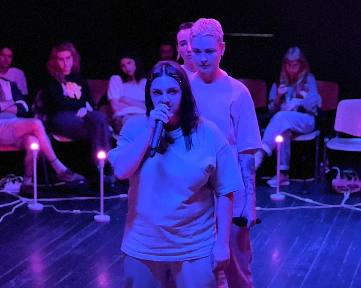 „Pluta”, un spectacol de teatru-în-teatru inspirat de povestea de violență trăită de alini (Alina Medoia, care semnează textul și regia) s-a jucat pe fundalul unui val de mărturii ale actrițelor și fostelor studente ale facultăților de arte despre abuzurile suferite din partea profesorilor și colaboratorilor lor. E, totodată, un semnal de alarmă la adresa violenței psihologică ce poate apărea în școală sau la muncă în mediile artistice. „Pluta” s-a văzut în 2023 și 2024, cu mai multe variante de distribuție. Eu l-am prins pe 14 septembrie la CNDB cu Ioana Chițu, Sofia Zadar și alini în distribuție, scenografie de Alex Horghidan și Mișa Dumitriu și muzică de Sofia Zadar.