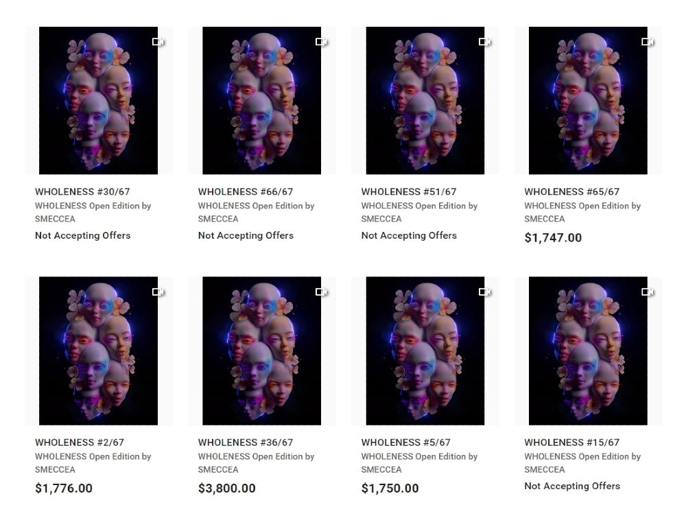 Una dintre artistele mele favorite, Smeccea, a pus această lucrare, un loop 3D, la vânzare în 67 exemplare, ceea ce înseamnă că vor putea exista 67 de proprietari cu 67 NFT-uri diferite pentru 67 de originale identice din aceeași serie, dar cu prețuri diferite, setate de artist în funcție de cerere.