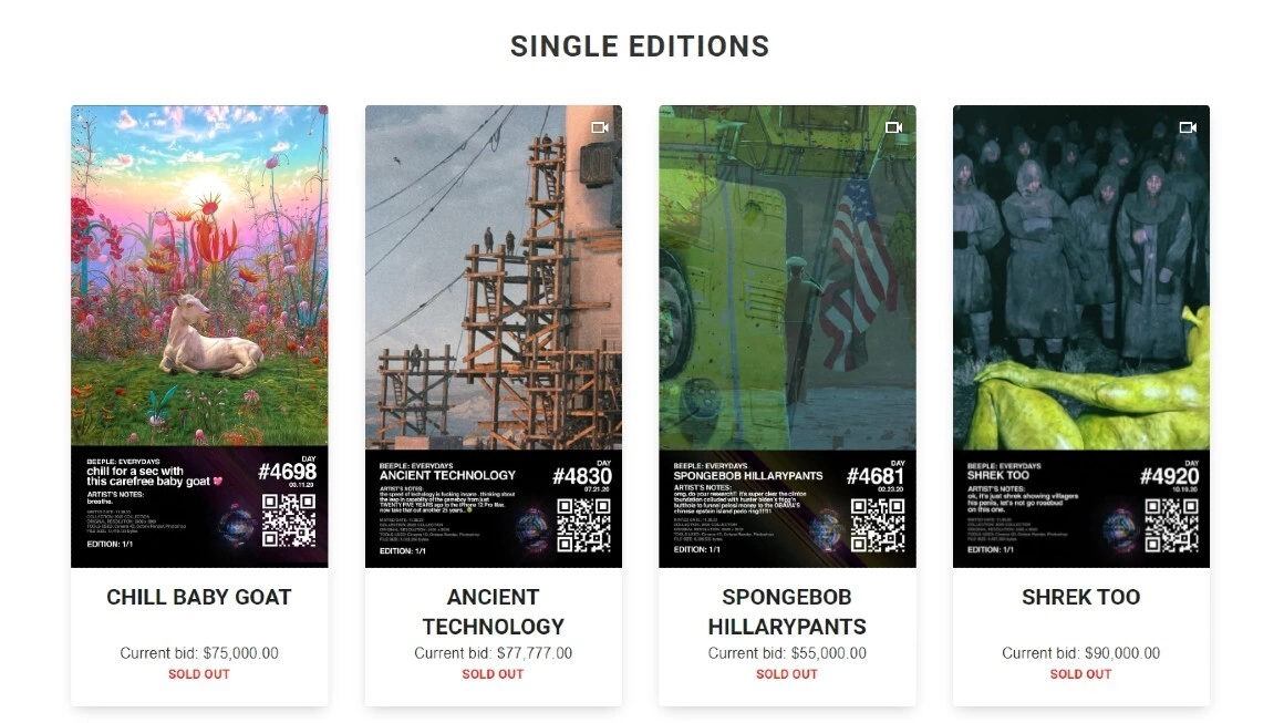 Beeple este un creator de conținut digital cu peste două milioane de followers pe instagram, care a influențat o generație întreagă de artiști vizuali în ultimele două decenii. A lucrat cu o mulțime de artiști pop, inclusiv cu Ariana Grande, Justin Bieber sau Nicki Minaj, și multe dintre ilustrațiile lui de-acum vreo zece ani sunt de-a dreptul incorecte politic, pline de conținut rasist, sexist, transfob și homofob. Astăzi, ilustrațiile lui sunt colaje 3D cu teme și personaje politice binecunoscute, ca Trump, Kim Jong-Un sau Putin, cu corpuri și trăsături grobiene, sau peisaje distopice inundate de simboluri pop culture.