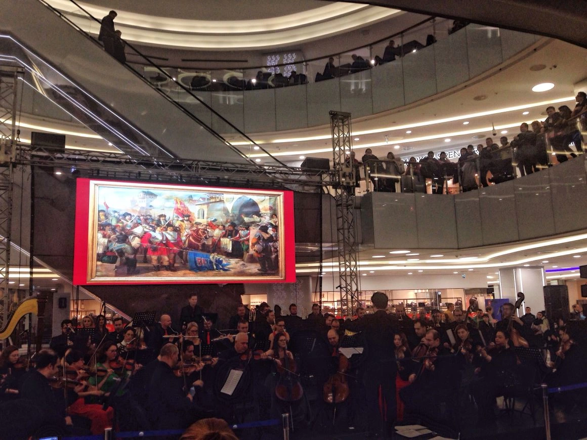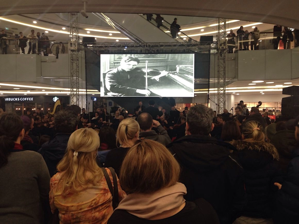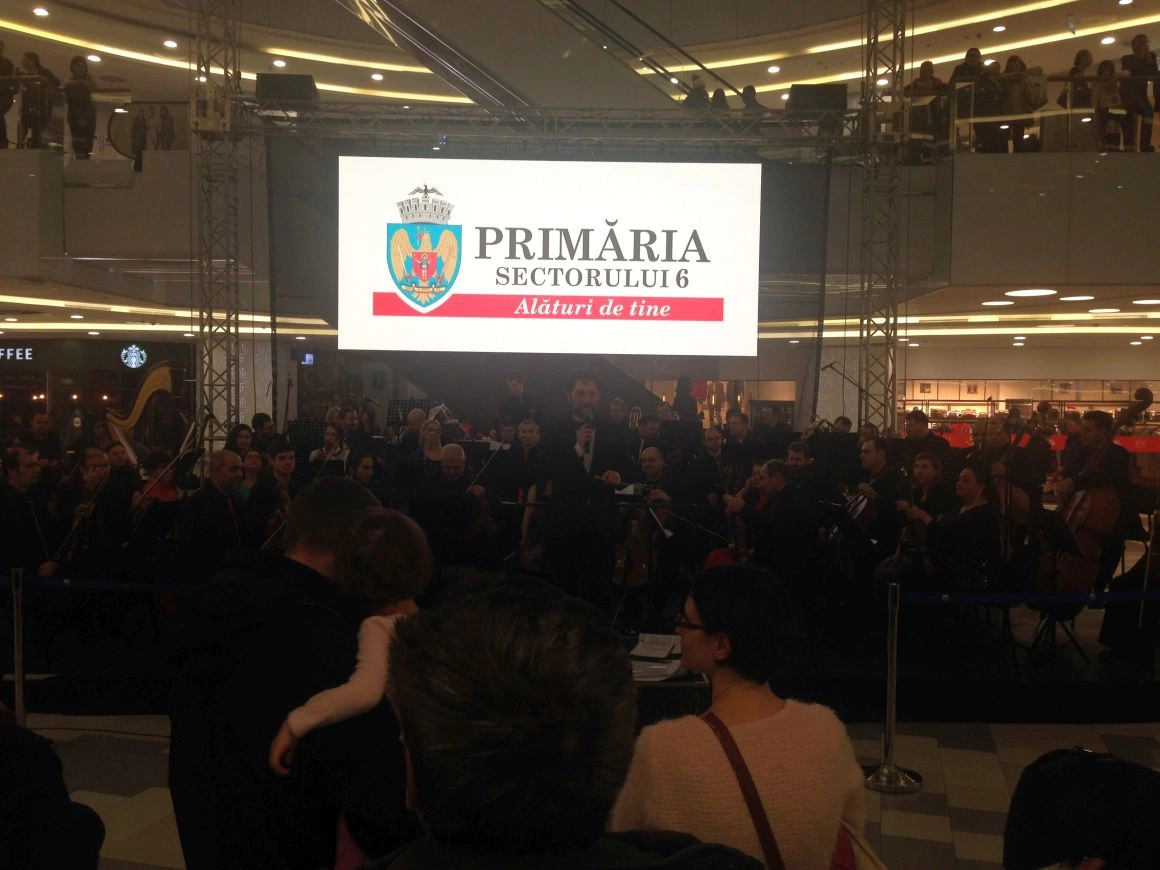 Apoi, o voce i-a anunțat pe shopper-i în difuzoare că va începe un „concert extraordinar”. Muzicienii și-au luat pozițiile pe scaune și-au făcut să răsune o oază de românitate într-o mare de branduri occidentale. Ochiometric, erau vreo 200 de oameni în public, pe trei niveluri. Nivelurile de sus păreau niște loje îndepărtate dintr-o sală de spectacol. Rapsodia nr. 1 a lui Enescu a planat peste sutienele de proastă calitate, importate de cine știe unde, însoțită de-o poză alb-negru cu marele compozitor român, care era proiectată pe un ecran mare. Apoi, soprana a venit la microfon să recite ceva din Eminescu. „Peste vârfuri, de Mihai Eminescu: (...) De ce taci, când fermecată inima-mi spre tine-ntorn?”.