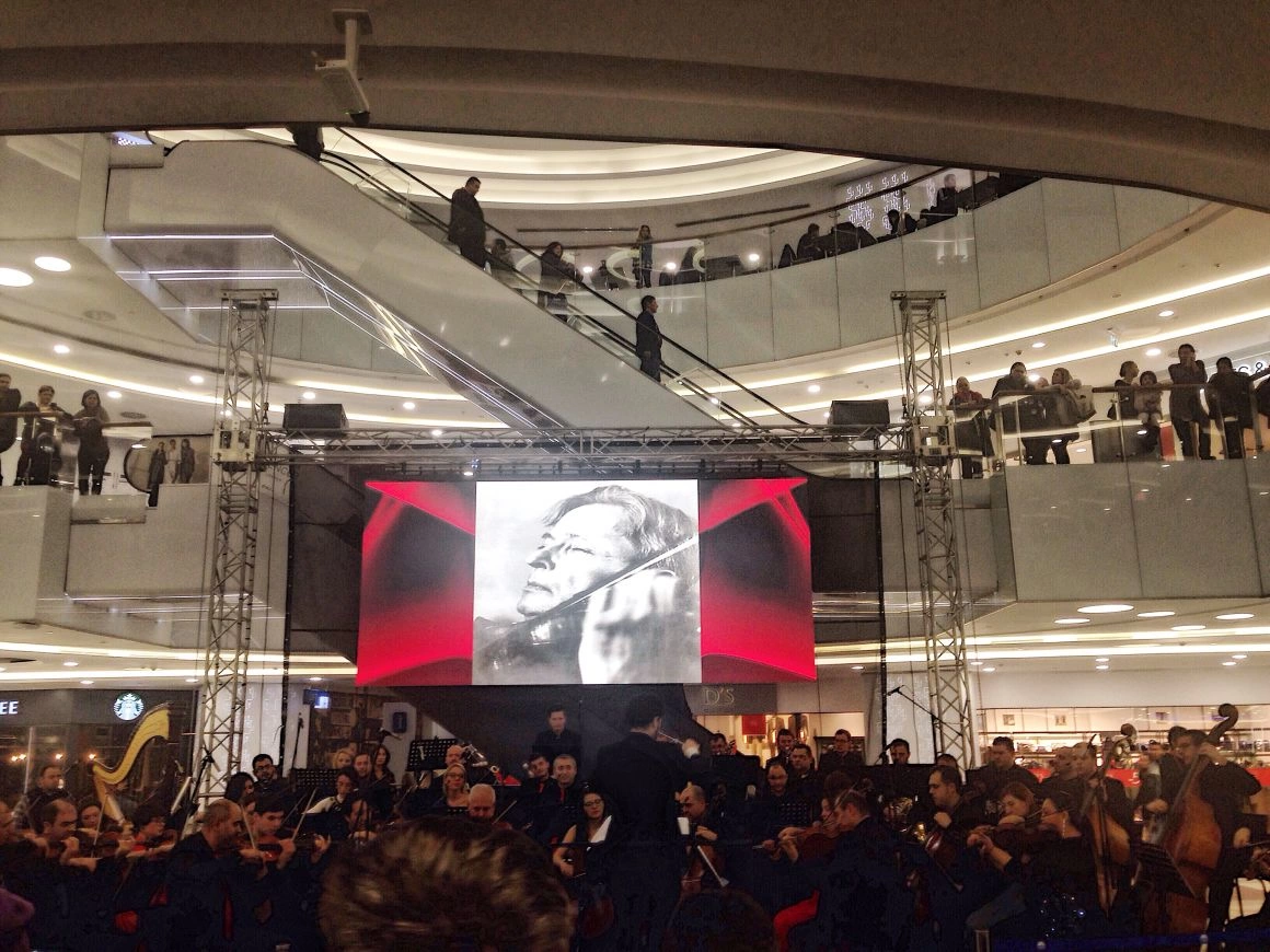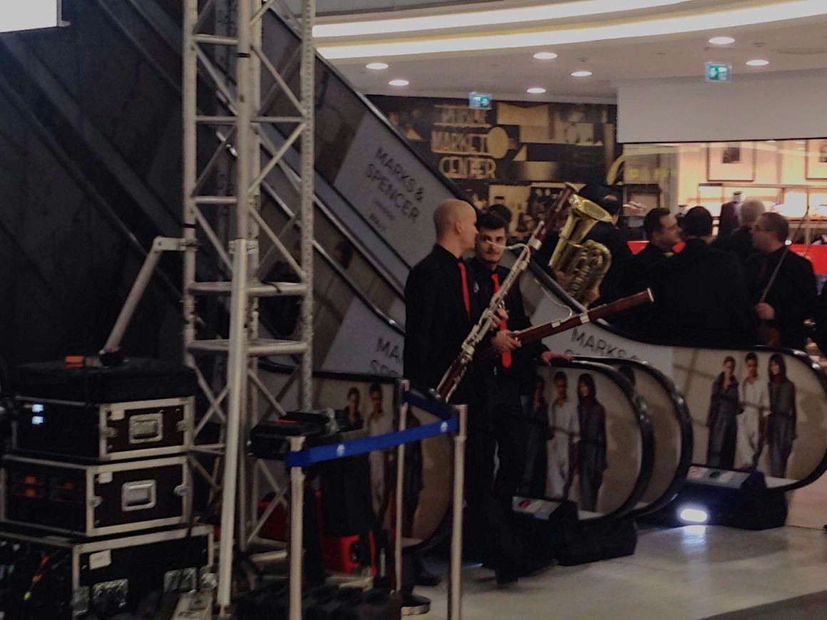 Cât am făcut un tur al mall-ului și m-am pierdut, orchestra a dispărut. Scaunele-au rămas goale și câțiva oameni în așteptare. Oare muzicienii se duseseră să mai prindă ceva din Assasin’s Creed la Movieplex sau să bage nişte aripioare picante? Am ieșit să mă plimb cu întrebările astea-n minte și m-am întors cu zece minute înainte de concert. Muzicienii forfoteau acum cu instrumentele printre oameni și prin magazine, stăteau la poze, cântau pe scările rulante. Unul a intrat cu partenera lui și c-un arcuș în mână într-un magazin cu lenjerie intimă. Au inspectat sutiene și-au ieșit criticând calitatea lor. Totul era jovial, informal, nu era atmosfera aia solemnă, cu dress code şi statut, dintr-o sală clasică de concerte simfonice.