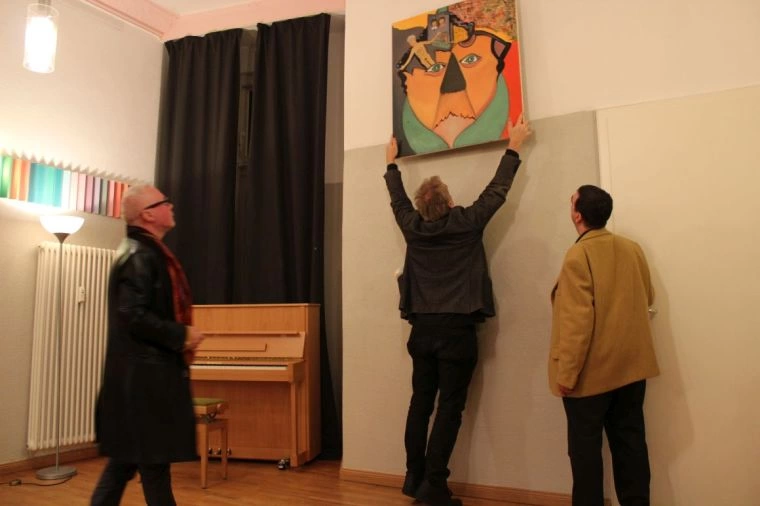 În plus, mi se pare boring. L-am rugat odată pe un prieten pictor să-mi arate niște chestii, dar când am văzut, de exemplu, cât de matematic calculează proporțiile, mi-am băgat picioarele. Dar, deși am progresat tehnic, inevitabil, în anii ăștia - am exersat la desen în paralel cu pictura - mă lovesc de o eternitate de chestii pe care nu știu să le fac și mai dau câte-un pumn în bufetul din bucătărie, apuc șpaclul și înec totul în straturi de culoare. Mi-a încolțit o dorință de profesionalizare și, sperând că nu voi ceda presiunii de-a face niște studii, mi-am propus să merg mai departe ca autodidact, dar mult mai temeinic. Recent, am avut un impuls în direcţia asta: prima expoziţie la care-am participat. Și nu oriunde, ci într-un centru social din Berlin. Alături de artistul Laurenţiu Zloteanu, autodidact și el, care m-a tot îndemnat să expun, şi graţie lui Gabi - un asistent social plecat de 20 de ani din România, care s-a trezit dintr-odată să facă un proiect de curatoriat artistic, Artă Liberă.