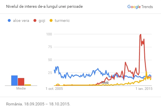 Căutările nu rămân în zona de soluții punctuale, ci se extind și în cea de ingrediente minune. La o scurtă căutare în Google Trends, după ingrediente sau plante des pomenite în media, am descoperit că există hit-uri alimentare. Spre exemplu: căutările după termenul aloe vera au crescut în 2005, iar apoi au stagnat începând cu 2011. Pe de altă parte, pentru goji, căutările au început în 2010, au avut o creștere în 2014, ca mai apoi să stagneze. Similar este și cazul turmericului, care pare să fi fost „descoperit” cel mai târziu, în 2011, ajungând să fie vedetă în 2015. În prezent, căutările pentru acești termeni au ajuns la același nivel de interes – pentru ei se fac zeci de căutări lunare –, lăsând loc unui alt ingredient sau aliment minune.