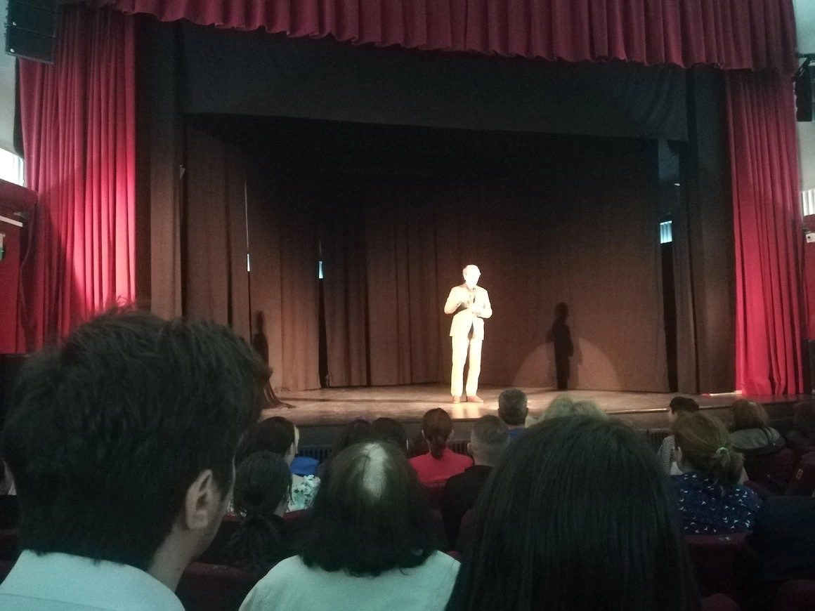 Ușile se deschid către o sală vopsită într-un roșu apăsător, slab luminată, și în cadrul ăsta încărcat se ivește o ceartă undeva în spate. Vocile coboară treptat, iar sala se umple încet cu vreo 300 de cetățeni de toate vârstele. Intră printre rânduri și Gabriel Fătu, cunoscut pentru farsele de la OTV, omul uns în 2016 ca manager al Universității Populare „Ioan I. Dalles”. Instituția, ce gestionează și sala de spectacole în care ne aflăm, ține de Primăria Capitalei, funcționează deci pe bani publici. Universitatea e o gazdă bună pentru evenimente controversate: a doua zi după conferința lui Dan Puric, va fi aici o alta despre „vindecarea trupului prin credință, iubire și post”, la care va participa medicul Pavel Chirilă, membru de bază al Coaliției pentru Familie.