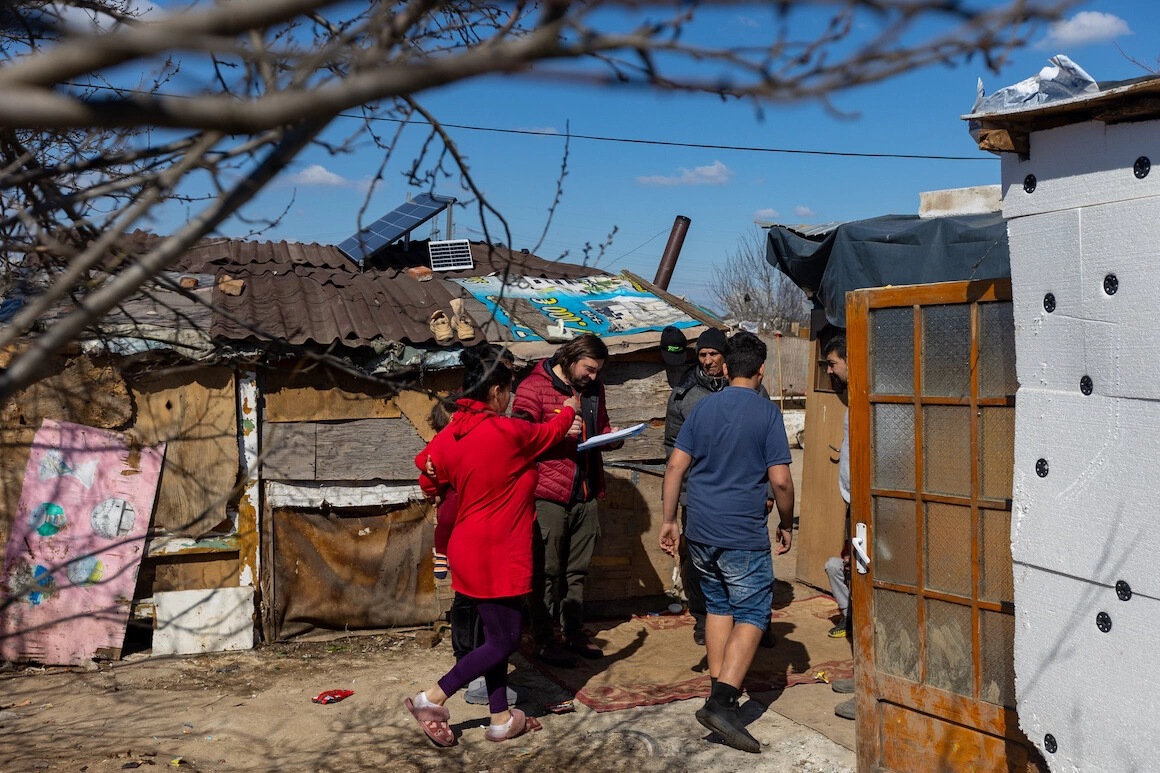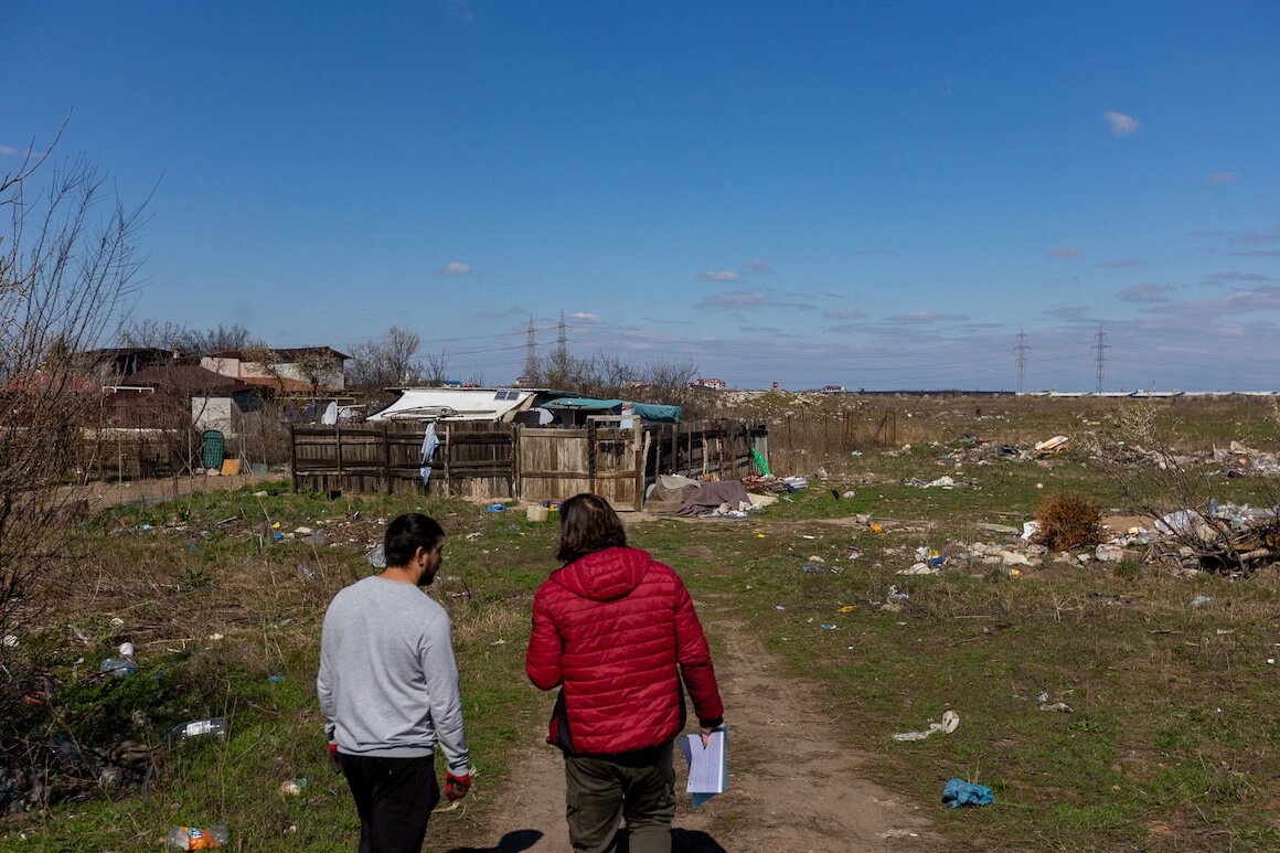 În martie anul acesta, am revenit cu Iulian Angheluță de la „Free Miorița” pe teren, de data asta în Voluntari, la câțiva kilometri de centura Bucureștiului. Mai mult de douăzeci de oameni, printre care și mulți copii, locuiesc în șapte case improvizate, construite puțin câte puțin în ani de zile. În urmă cu trei ani, Iulian a instalat panouri solare pe acoperișurile câtorva case, iar acum alte două familii care locuiesc acolo i-au cerut ajutorul. De-a lungul timpului, Free Miorița a instalat panouri fotovoltaice pentru 279 de familii, 4 școli și 2 biserici din toată țara și a branșat la rețeaua de curent alte 14 gospodării.