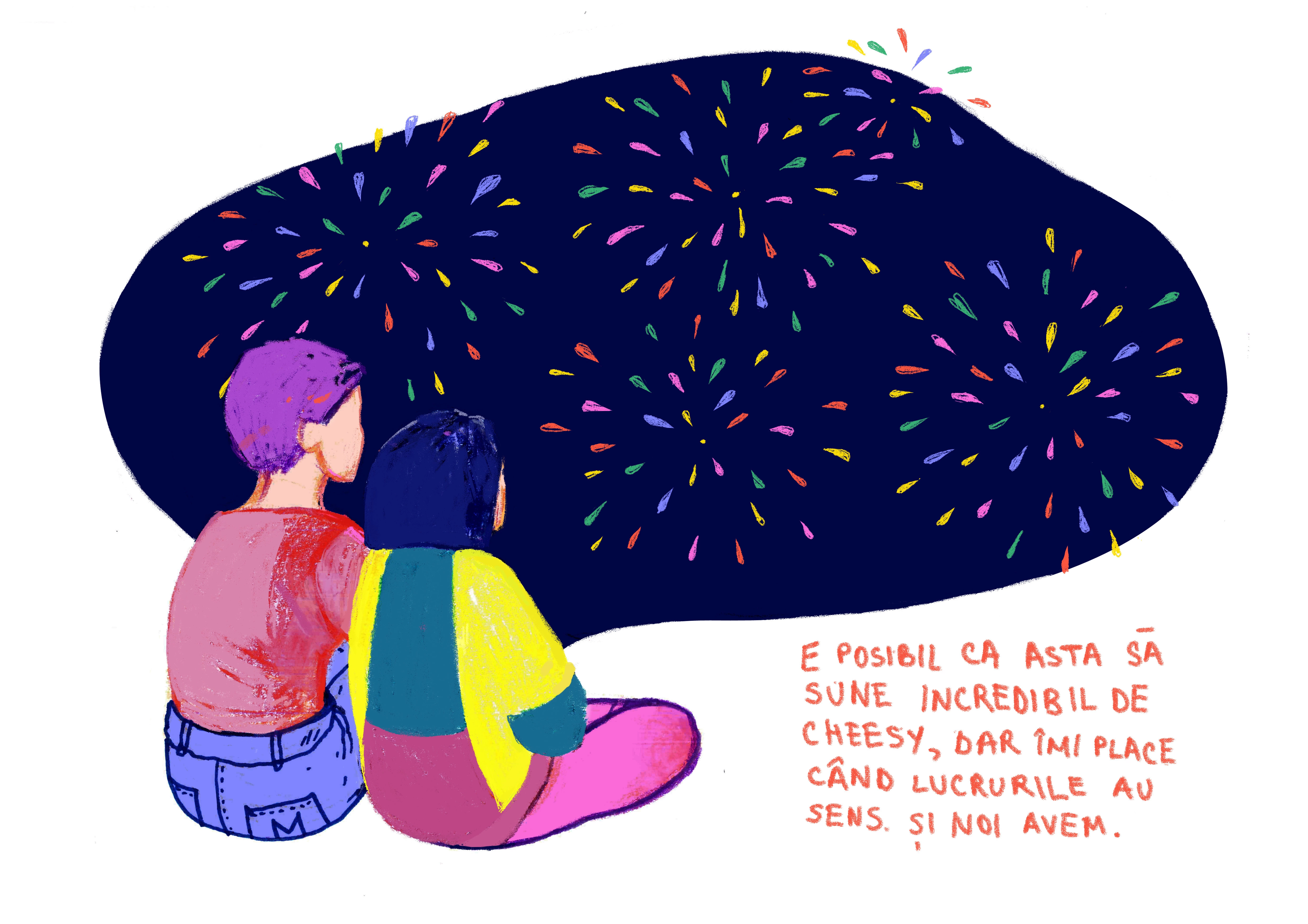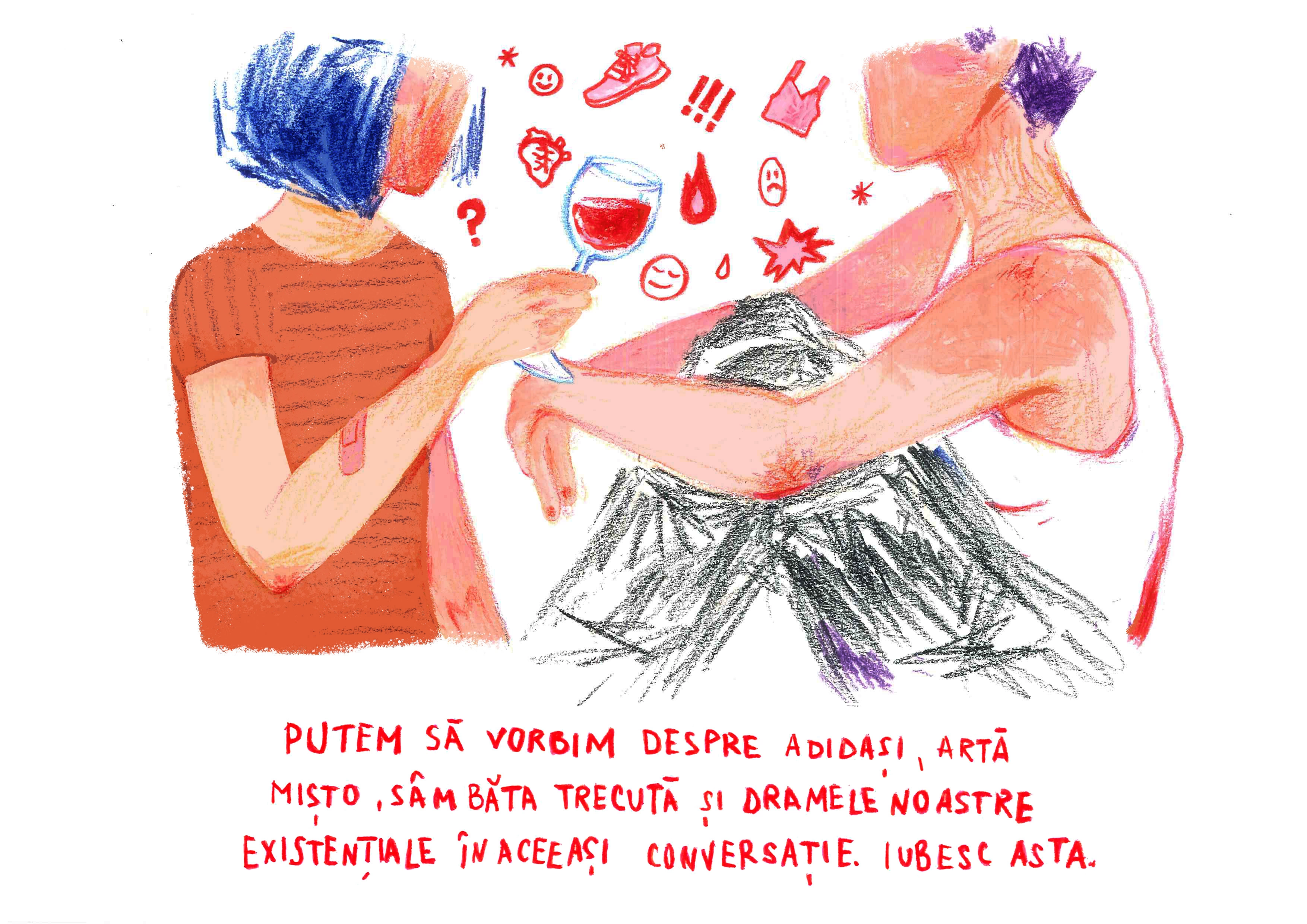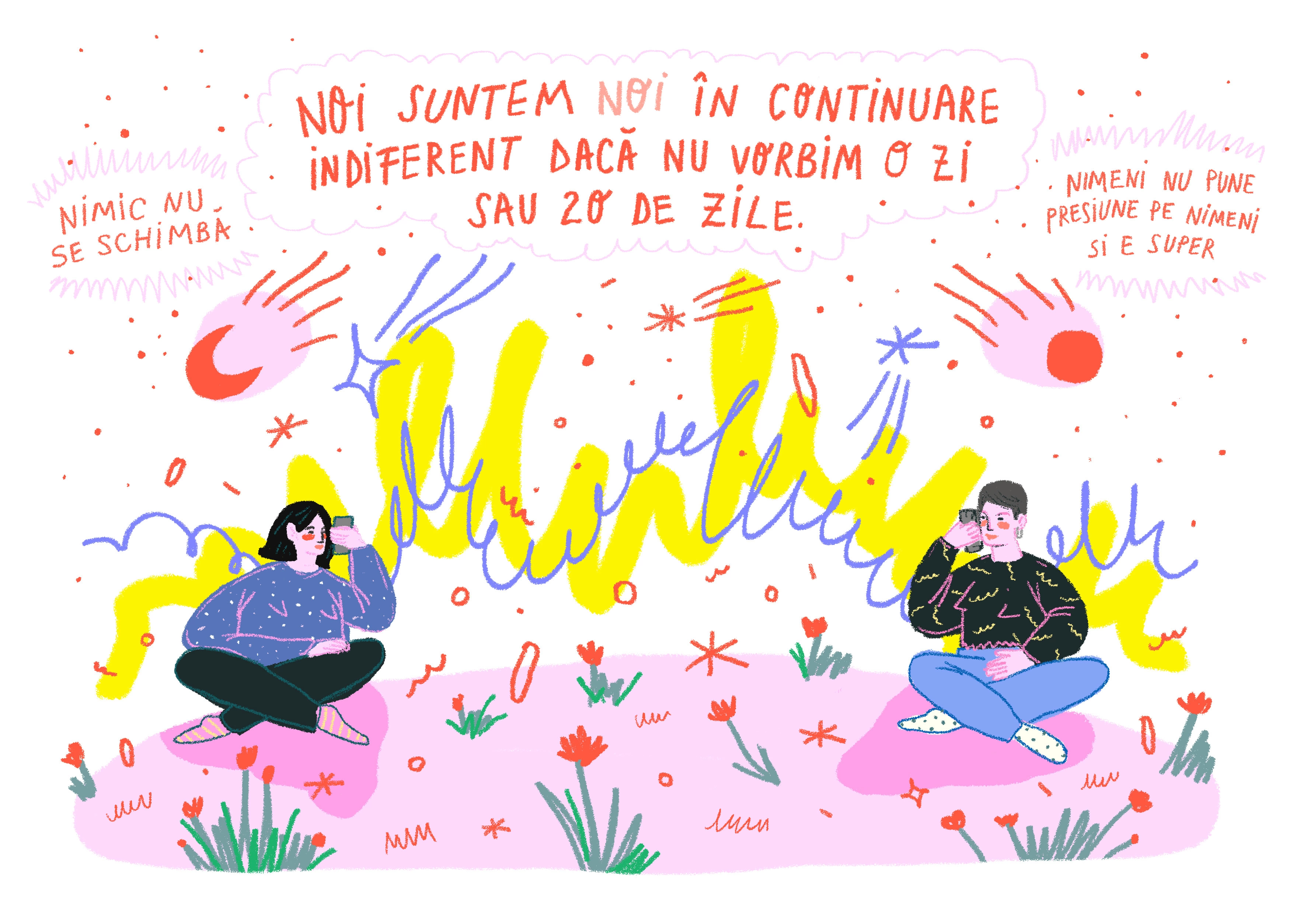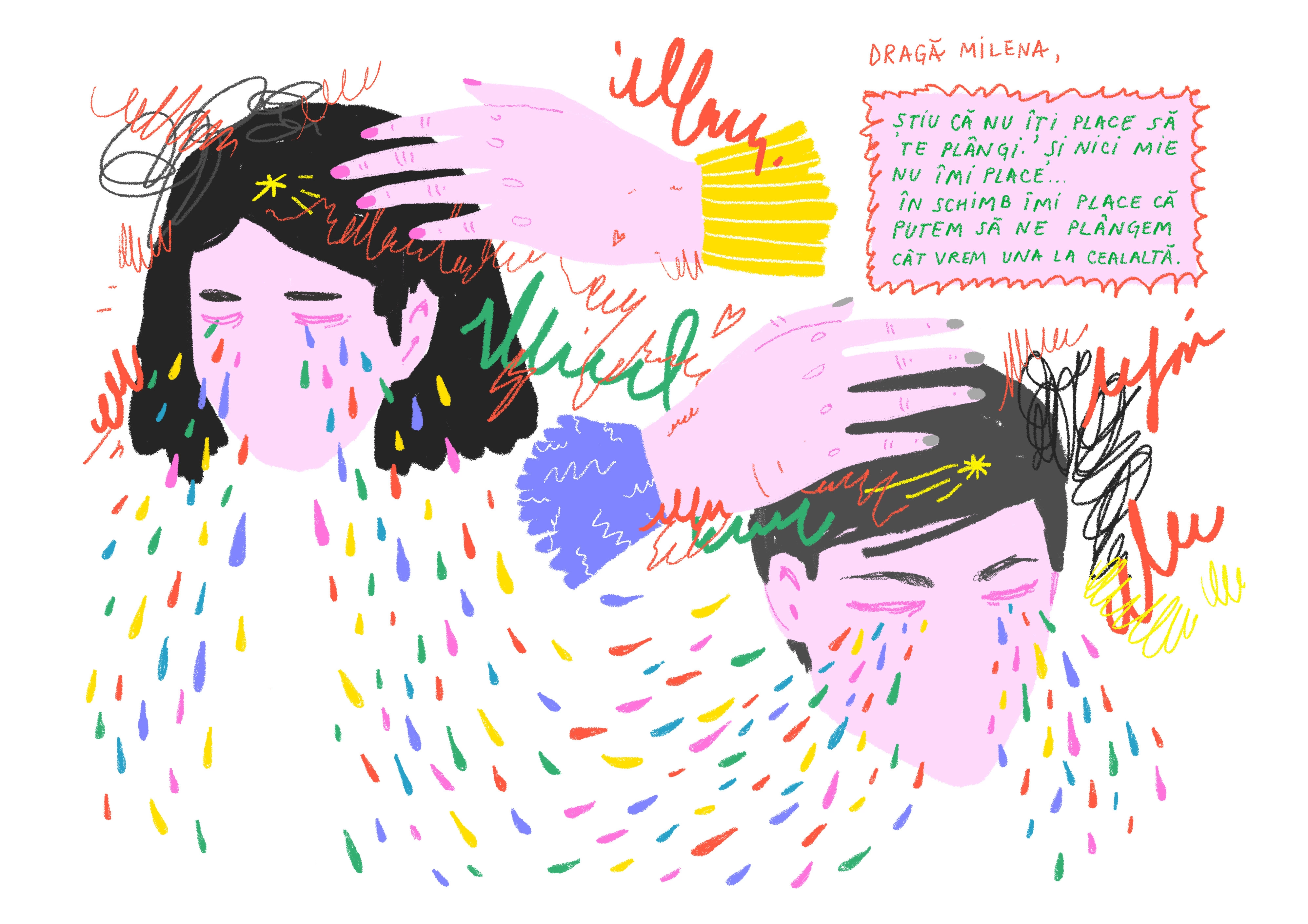 Am rugat două ilustratoare tinere, Milena Mistodie și Livia Fălcaru, să vorbească despre prietenia lor într-un schimb de scrisori ilustrate. Cele două s-au împrietenit când erau la liceu în Galați. S-au cunoscut în centru, locul de întâlnire pentru toți adolescenții din orașele de provincie. Milena i-a desenat Liviei un „unicornpotam” pe picior. Acum locuiesc în orașe diferite, Cluj-Napoca și București. Se văd mai rar, dar prietenia lor la distanță e stabilă.