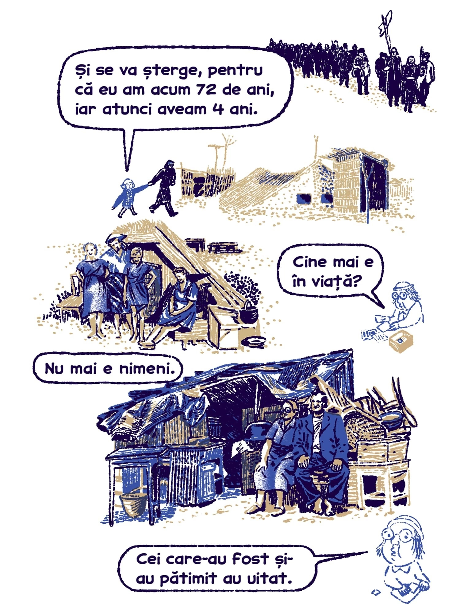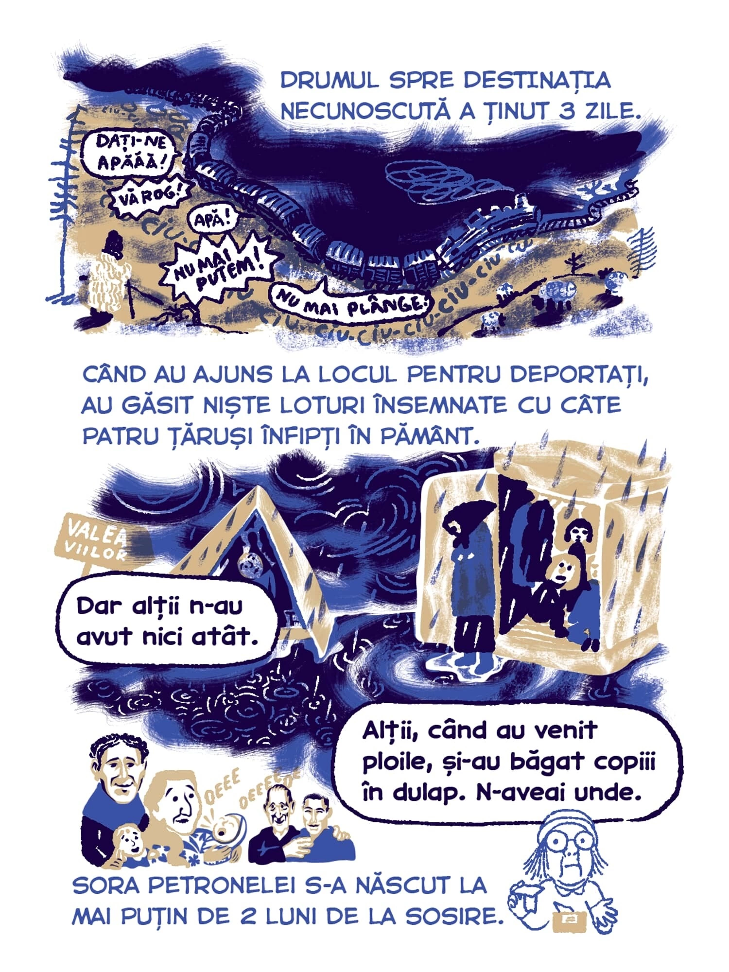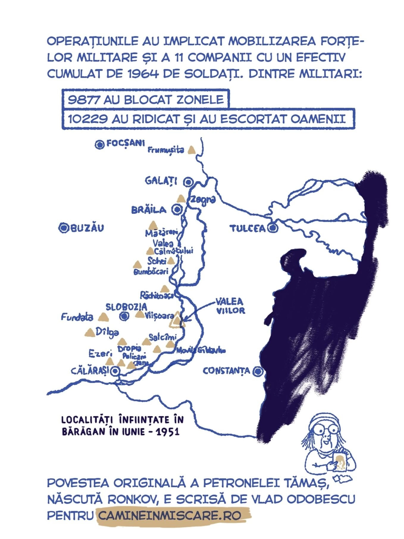Continuăm seria de benzi desenate Tur Banat cu o poveste despre deportări, bazată pe documentarea jurnalistului Vlad Odobescu. Petronela Tămaș avea patru ani în 1951, când a fost deportată în Bărăgan, alăuri de familia ei. Ca ei au mai fost câteva zeci de mii de locuitori din vestul țării, pe care Gheorghe Gheorghiu-Dej i-a mutat cu forța în celălalt capăt al țării, de teama unor posibile neliniști politice. Sorina Vazelina a ilustrat bucata asta de istorie, așa cum a traversat-o Petronela, care a cunoscut încă din copilărie nesiguranța și frica, pe care regimul comunist și sistemul lui de securitate au transformat-o într-o armă de control în masă.