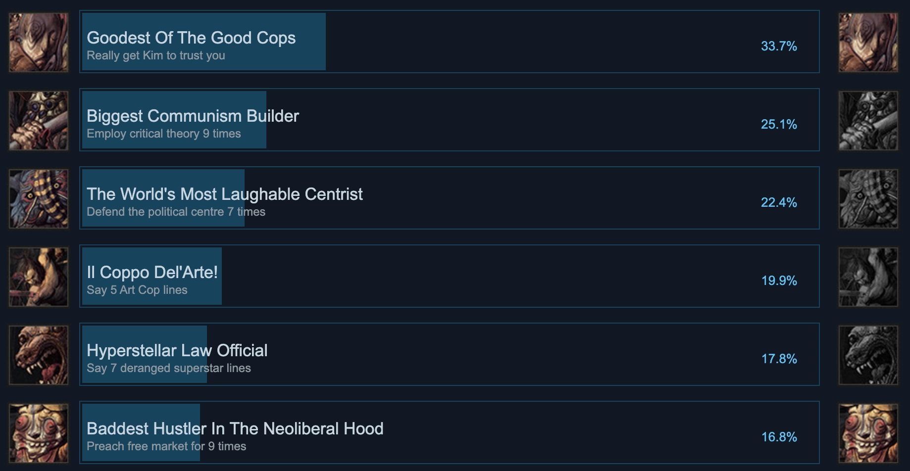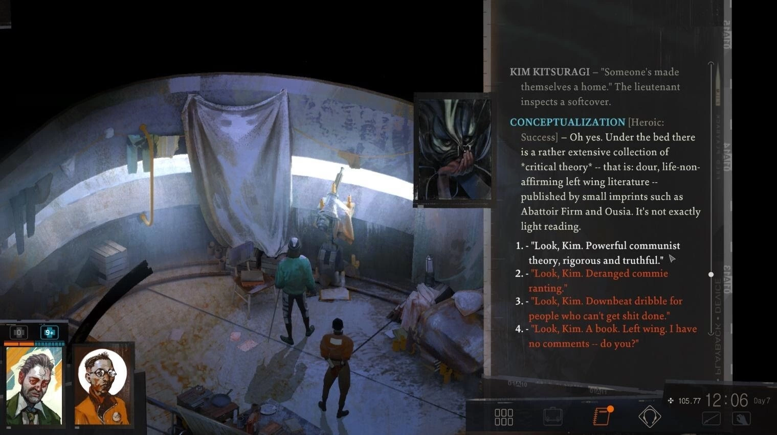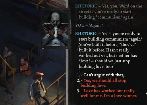Disco Elysium este printre puținele jocuri în care esteticul se confundă cu politicul. De altfel, Helen Hindpere, care face parte din echipa narativă, i-a menționat pe Marx și Engels ca formatori ai educației sale politice și lideri sprituali ai jocului, iar asta face ca Disco Elysium să aibă un mesaj politic radical, puternic anti-capitalist. Așa de serioasă era treaba încât ZA/UM a invitat-o pe Dasha Nekrasova de la podcastul Red Scare și pe gazdele podcastului Chapo Trap House, persoane importante din zona stângii contemporane, de care cu siguranță ai auzit, dacă ești familiar cu comunitatea dirtbag left, să împrumute vocile lor personajelor din joc, conferind astfel și mai multă autenticitate mesajului anti-capitalist.