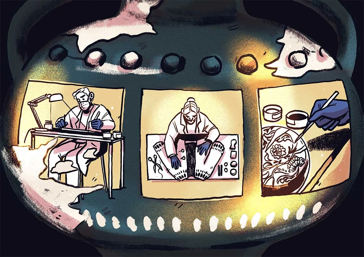 Metafora restauratorilor-doctori mi-a fost repetată de fiecare dintre cei cu care am vorbit pentru acest material. Și pot să înțeleg: obiectele care au supraviețuit timp de sute de ani, uneori chiar mii, ajung la ei bolnave, frânte, murdare. E treaba lor să le facă sănătoase, întregi, curate, în așa fel încât să mai supraviețuiască alte sute sau mii de ani.