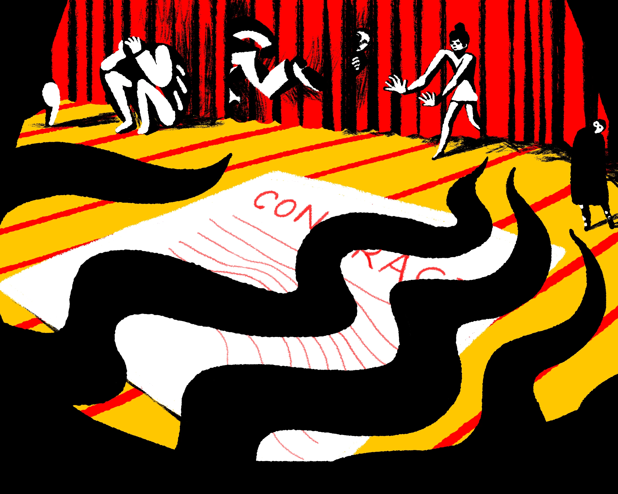 În birou intră jurista teatrului și totul capătă brusc un ton strict profesional. „Mi-a dat o sumă mică, dar cumva acceptabil”, spune D., care ceruse 2000 RON și a primit mai puțin. Sumele sunt confidențiale, spune ea, dar valoarea contractelor de colaborare diferă în funcție de decizia directorului. În plus, din trei în trei luni trebuie să renegocieze cu Poghirc prelungirea contractului și suma.