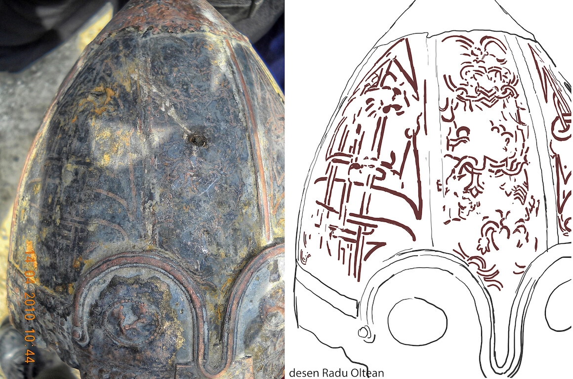 Nu erau cele mai bune fotografii, dar era clar o minunăție de coif și ăsta, unul extrem de rar, cum nu mai există decât prin Rusia, și acolo câteva. Era făcut din bronz, decorat cu o pereche de ochi, element cu funcție magică. Mai avea niște ornamente complicate, roșii, „pictate” cu cupru pe calota de bronz, ce par de influență orientală. „Era o nebunie!”, spune ilustratorul.