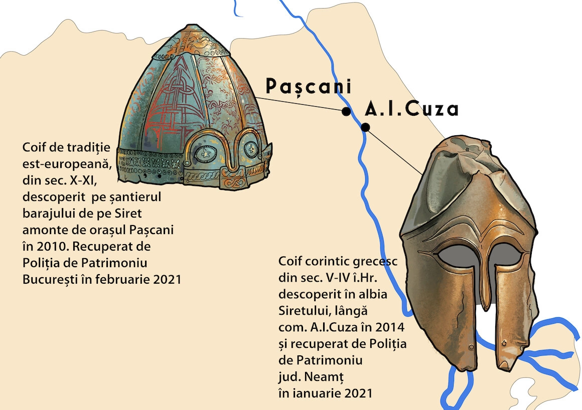 Coiful găsit în podul omului e de prin secolele V-IV î.Hr. și este o descoperire de senzație, pentru că se află într-o zonă foarte nordică. Un obiect similar a fost excavat în 2018 în Peninsula Taman în sud-vestul Rusiei, dar era făcut țăndări. Un altul — în nordul Mării Negre, în zona Odessa. Deși piesa nu era întreagă și pare că a trecut printr-un incendiu, ea a fost vândută în Statele Unite, la o licitație, cu suma de 200.000 de euro. Întrucât coiful găsit în albia Siretului e întreg, ar putea valora cel puțin dublu pe piața de profil.