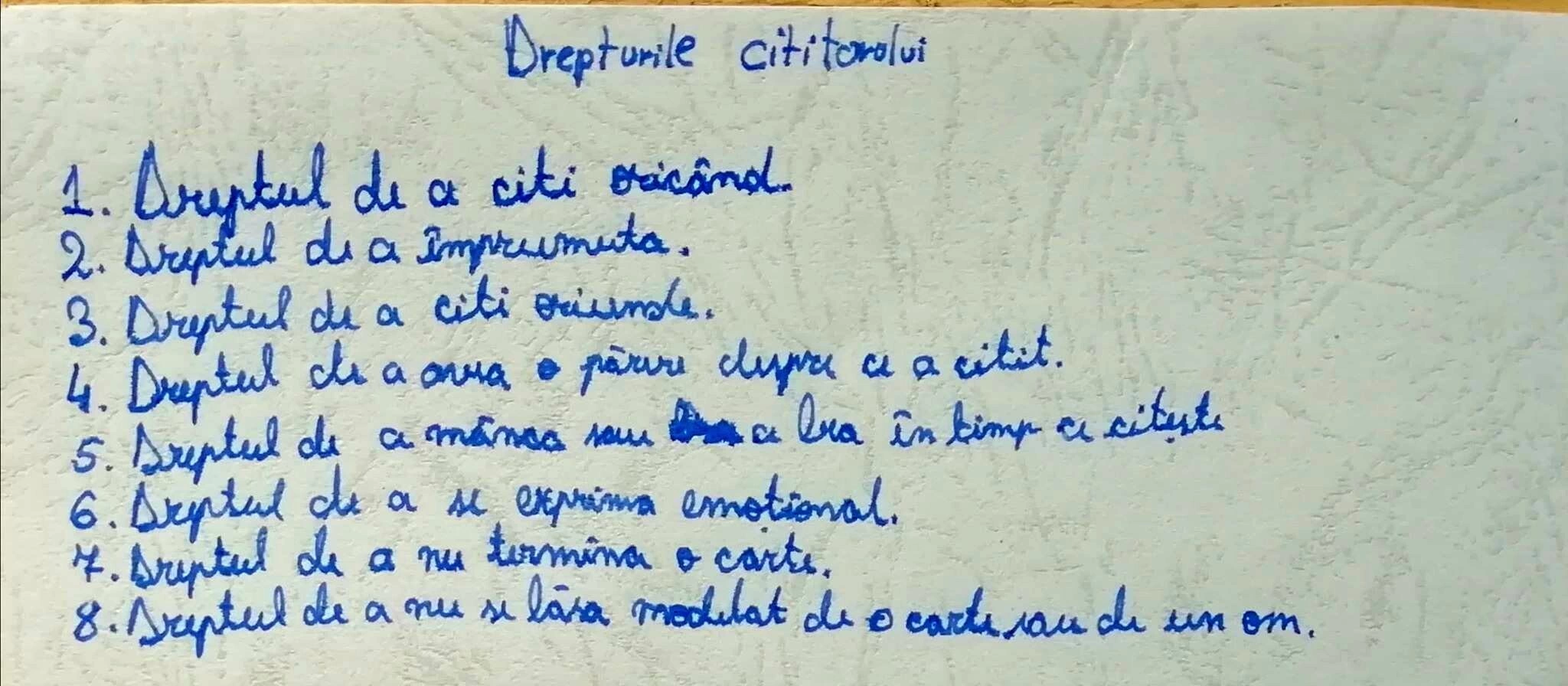 Pentru că cititorii au și ei drepturi. Unii le știu, alții nu, dar cel mai bine ar fi să vorbiți cu copiii despre subiectul ăsta. Eu așa am făcut azi cu Smaranda, fiica mea cea mare care până la 11 ani cât împlinește în curând, a citit o grămadă de cărți. De fapt, deși nu ne-am numărat cărțile până acum, cred că biblioteca ei este la fel de mare ca și a mea. Sunt și cărțile surorii ei mai mici, evident. Dar mezina noastră de șapte ani preferă încă să i se citească, refuză să o facă singură și, în orice caz, muzica i se pare deocamdată mult mai cool. Nu le-am obligat niciodată să citească, dar le-am cumpărat sau împrumutat de la bibliotecă multe cărți și avem un obicei în familie: nu ne culcăm fără să ne citim unii altora. Deși seara suntem de obicei obosiți, cititul împreună ne limpezește un pic mintea înainte de odihnă. Acasă ne ținem departe de toate teoriile despre literație, pur și simplu este un obicei plăcut pe care îl putem face oricând împreună.
