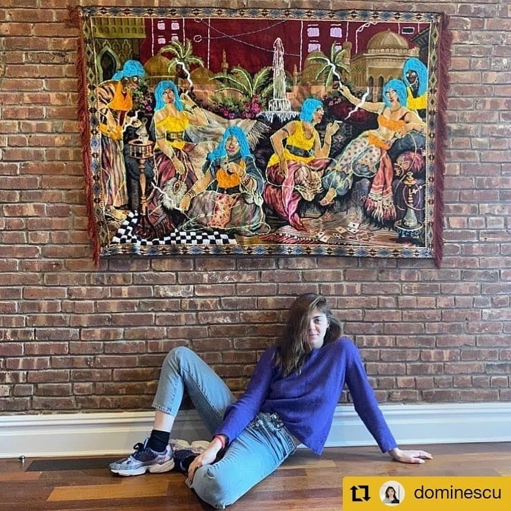 Săptămâna trecută, Megan Dominescu a participat la o expoziție de grup la New York, „A Room of One’s own”, iar una din lucrările de-acolo e o carpetă turcească primită de la bunica, cu șase femei care fumează. A brodat pe varianta originală, iar femeile au primit costume de baie, păr albastru și ruj. „E un fel de spațiu contemporan, sunt tot ele acolo, dar aduse în 2020”, spune ea.