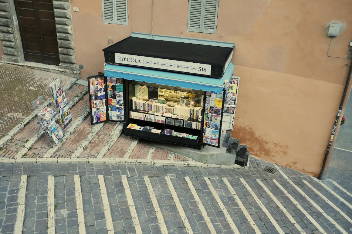 Undeva la capătul unor scări de piatră, cu o biserică în dreapta și cer italian deasupra, la granița dintre artă contemporană, mesaj politic, poezie și zonă editorială, se află un chioșc. Mic, doar 4 metri pătrați de spațiu infinit, scrie pe firma luminoasă. Suntem în Perugia, în centrul Italiei și o gheretă de ziare a răsărit parcă de nicăieri ca să scuture lumea de praf.