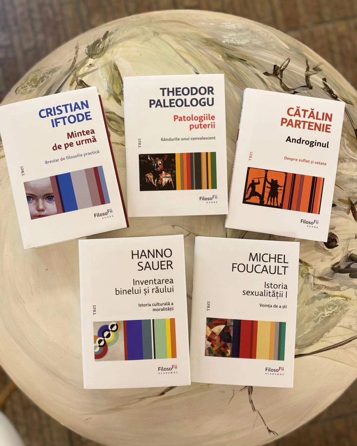 FilosoFii Agora, pe de altă parte, propune reflecții și eseuri care vizează publicul larg, iar o foarte fericită întâmplare face ca primele titluri să fie semnate de autori români: Patologiile puterii a lui Theodor Paleologu este o analiză despre limitele democrației și modul în care trebuie să ne raportăm la ele tocmai pentru a le evita, despre efectele nefaste pe care puterea le poate exercita asupra individului investit cu o funcție importantă; Mintea de pe urmă a lui Cristian Iftode este o culegere spectaculoasă de eseuri organic conectate între ele despre întrebările existențiale care caracterizează vârstele omului; Androginul lui Cătălin Partenie este o repovestire și o mise-en-scène filosofică a dialogului Republica a lui Platon.